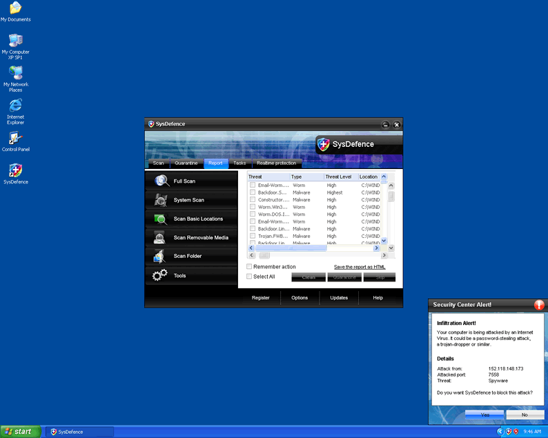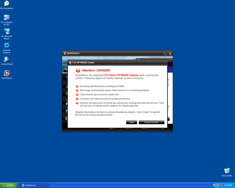 SysDefence is a malicious rogue antispyware program which has been created to deceive unaware users to waste their money. SysDefence is a part of the bestRogue family which comprises of TheDefend, GuardPCS, Security Fighter and a lot of more destructive rogue antispyware programs that try to trick people. Users may receive false system scans, false system scan report results or any false computer security announcements because the main goal of SysDefence is to persuade users to purchase the full version which, in fact, doesn't exist. Computer users should delete SysDefence from their PCs as soon as they detect it on their systems.
