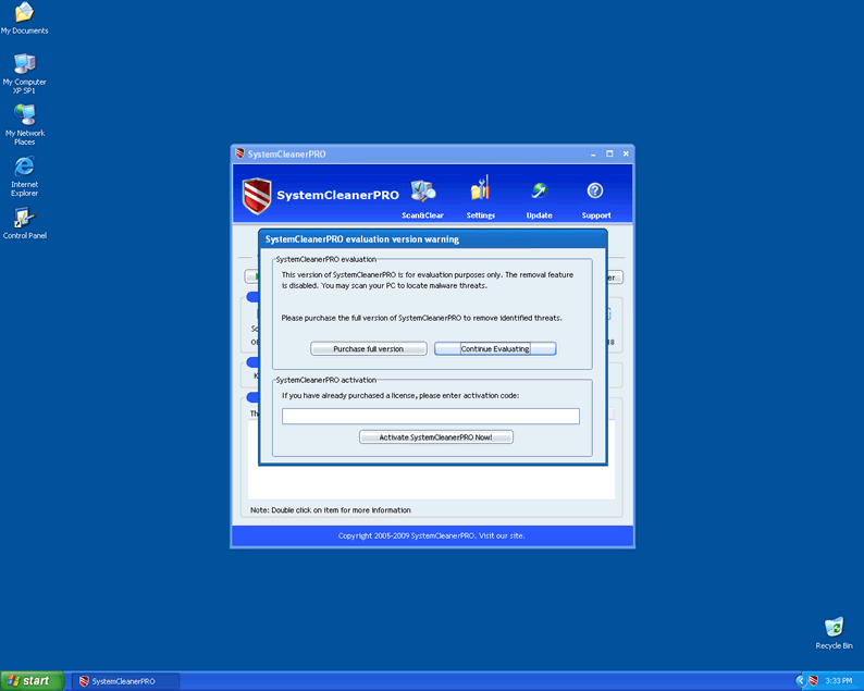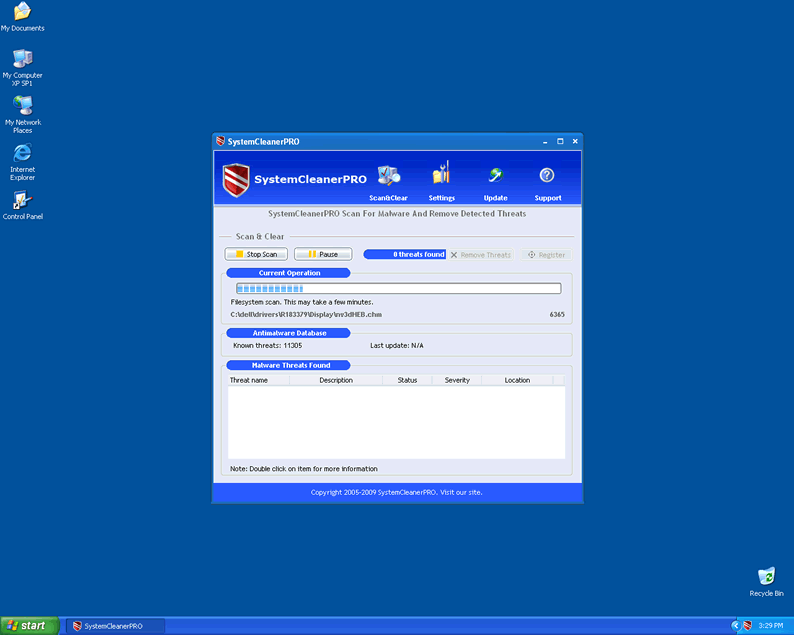 SystemCleanerPro is a variation of the rogue anti-spyware program Syscleaner. SystemCleanerPro's tactics are more agressive, and comes armed with new browser hijackers and aggressive popups claiming that your system needs to be fixed to run properly. Like other rogues, SystemCleanerPro claims that to fix the system you need to purchase a licensed version of SystemCleanerPro. SystemCleanerPro is a useless application that should not to be trusted and must be terminated as soon as it is detected.