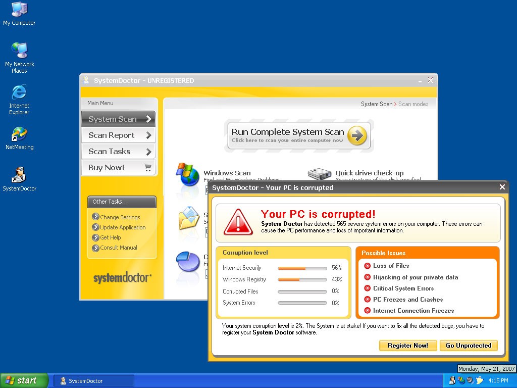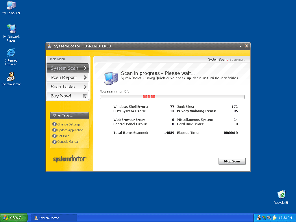 SystemDoctor, a ErrorSafe clone, is a rogue registry cleaner designed to fix errors in your system, but once installed it pops up exaggerated security threats to trick you into purchasing the SystemDoctor 2006 repair/maintenance application. SystemDoctor 2006 may display pop-up or pop-under ads while you surf the web. SystemDoctor may come bundled with other spyware and may install without your permission. Since SystemDoctor installs different variants on your hard drive, SystemDoctor Spyware can prove difficult to remove manually.