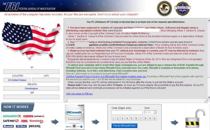 | 1 | The FBI Federal Bureau of Investigation All Activities of this computer has been recorded. All your files are encrypted. Don’t try to unlock your computer! Your PC is blocked due to at least one of the reasons specified below. Copyright and Related Rights law (Video, Music, Software) and illegally using and distributing copyrighted content, thus infringing Article I, Section B, Clause 8, also known as the Copyright of the Criminal Code of the United States of America. Article 202 of the criminal provides for deprivation of liberty for two or twelve yours. Illegal access has been initiated from your PC without your knowledge or consent, your PC may be infected by malware, thus you are violating the law On Neglectful Use of personal Computer. Article 210 of the Criminal Code provides for a fine of up to $100,000 and/or a deprivation of liberty for four to nine years. Pursuant to the amendment to the Criminal of United States of America of May 28,2011, this law infringement (if it is not repeated – first time) may be considered as conditional in case you pay the fine to the state. Fines may only be paid within 24 hours after the infringement. As soon as 24 hours elapse, the possibility to pay the fine expires, and a criminal case is initiated against you automatically within the next 24 hours! To unlock the computer, you must pay the fine through REloadit Pack of $300. To unlock your computer locked by the United States Cyber Security REloadit Pack fine Virus and to avoid other legal consequences, you are obligated to pay a release fee of $300. Payable through REloadit Pack via Walmart Card or Kmart Card etc. After successful payment, your computer will automatically unlock. |