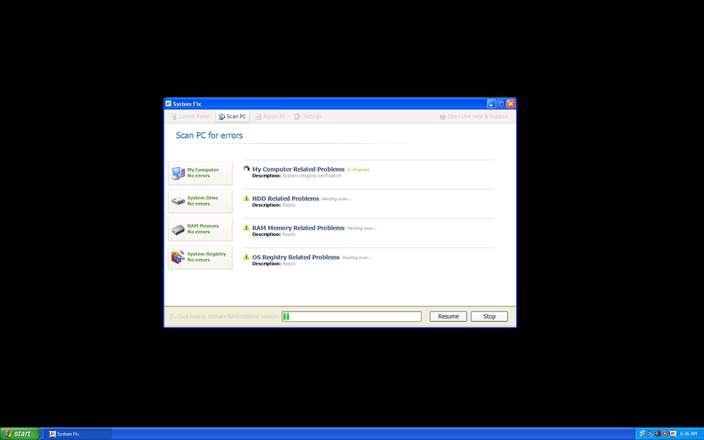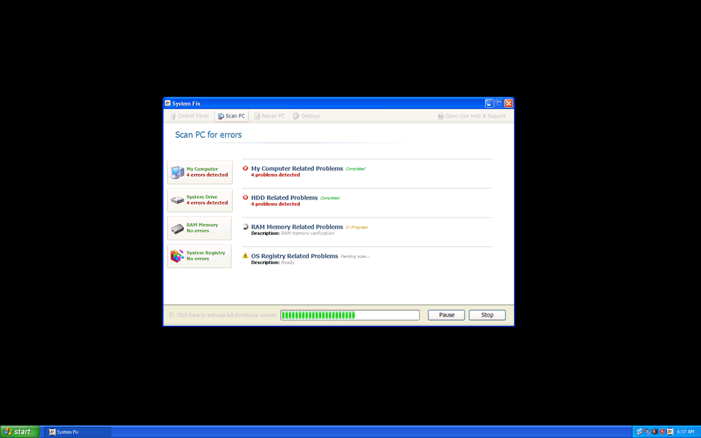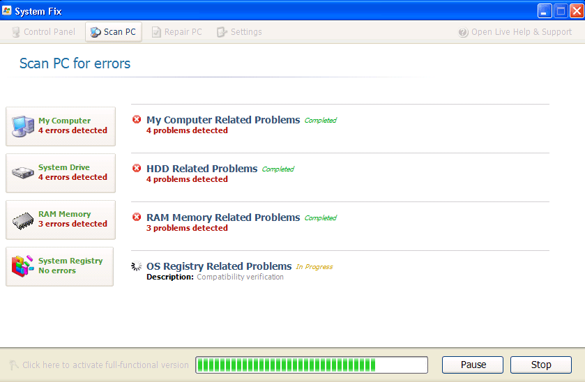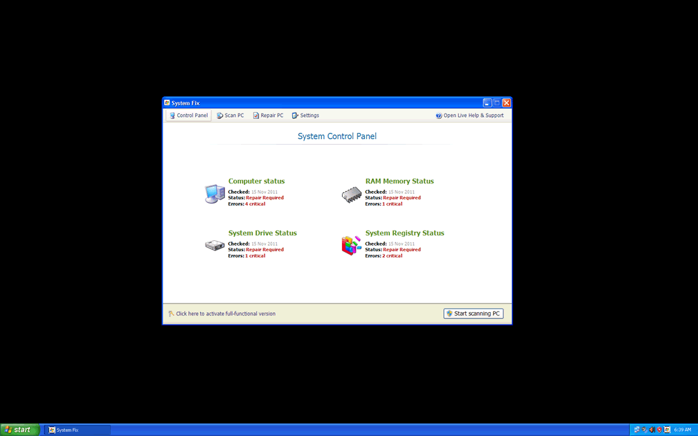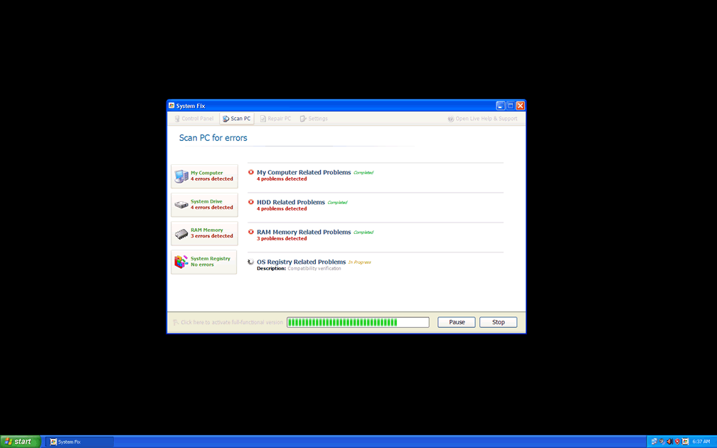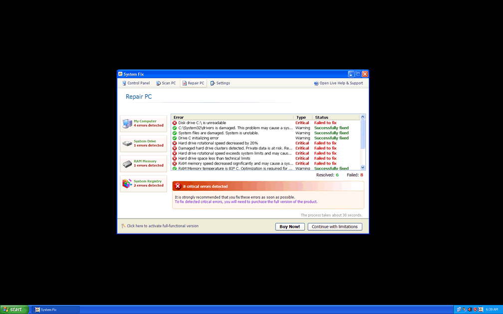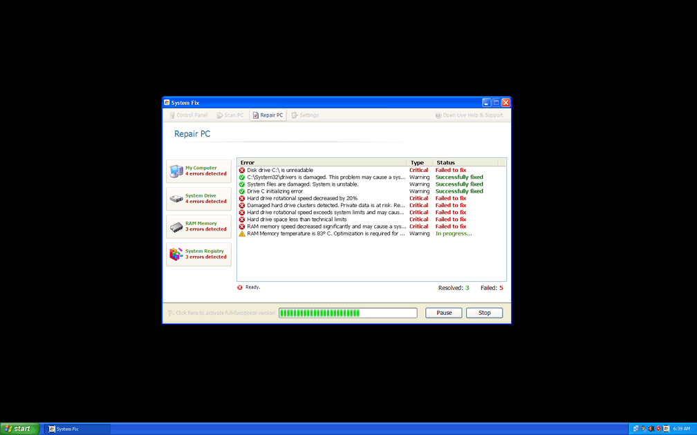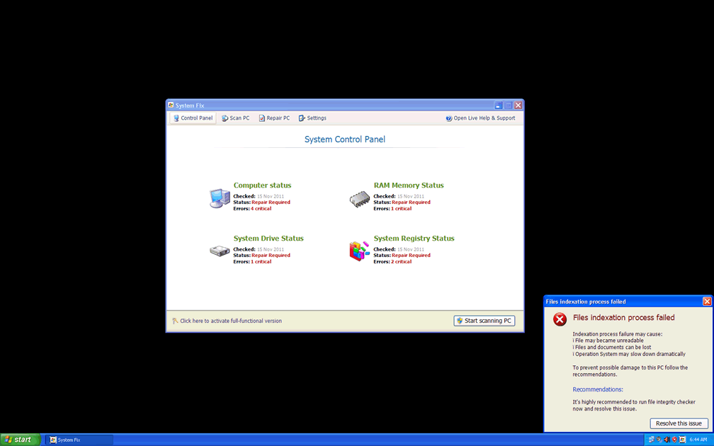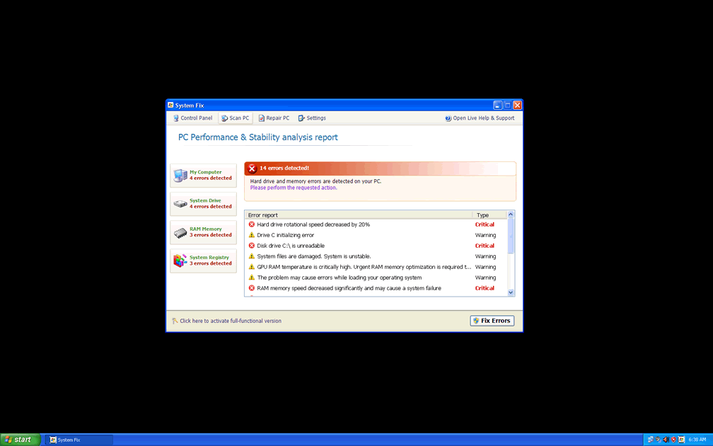 System Fix's most-apparent attack is its proclivity for creating fake alerts (and similar forms of system errors,) while System Fix is active in your PC – and, since System Fix launches itself on Windows startup, you can expect these pop-ups to appear very often. Examples of these misleading warning messages that SpywareRemove.com malware researchers have noted include: