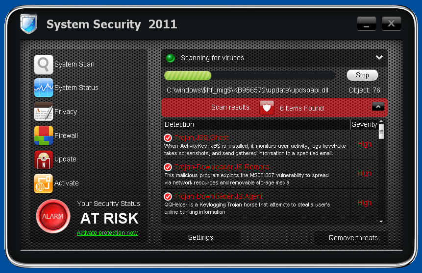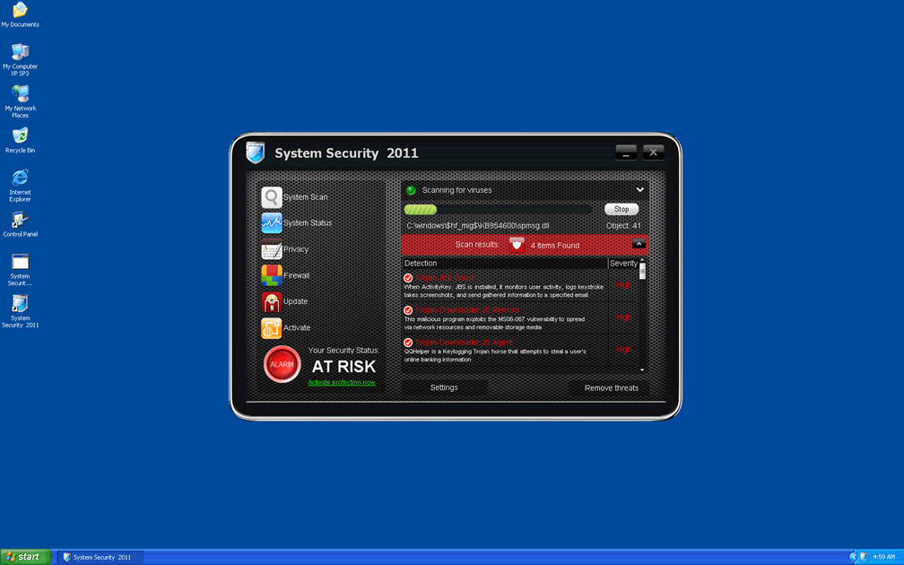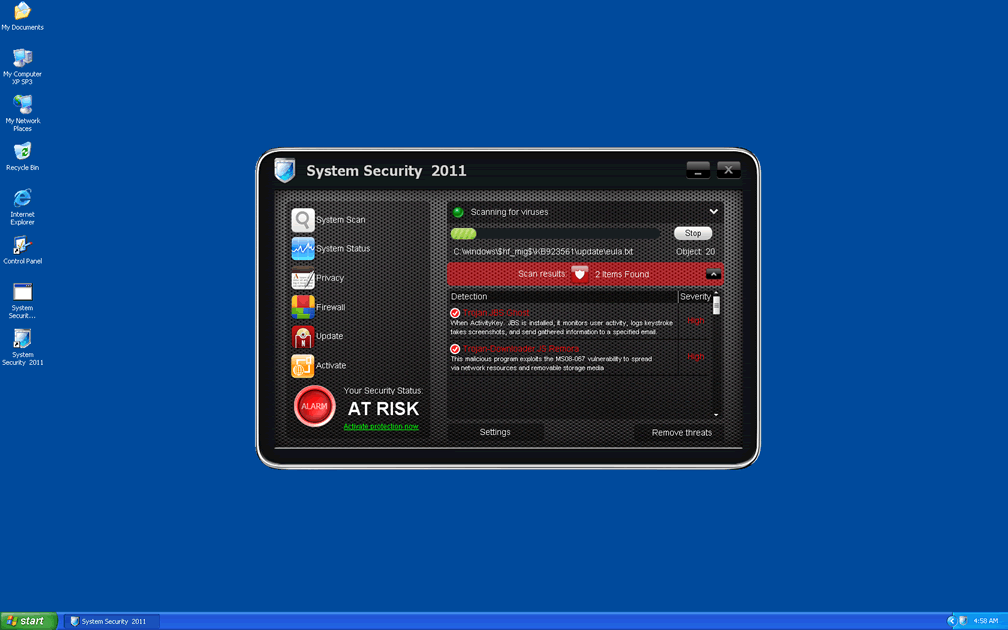 If you've been infected by System Security 2011, you'll be able to notice the signs right away, as System Security 2011 creates a legion of fake alerts and fake system scan results that imply that your computer is infected with Trojans, keyloggers and other high-level PC threats. Examples of these fake alerts, which, of course, you can completely ignore, are shown below: