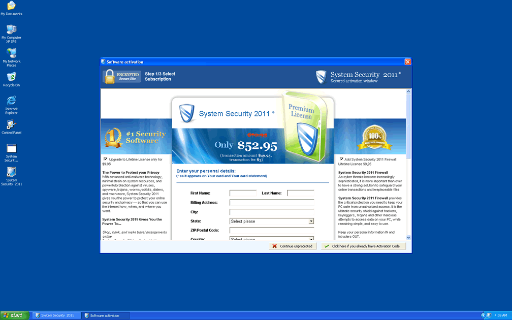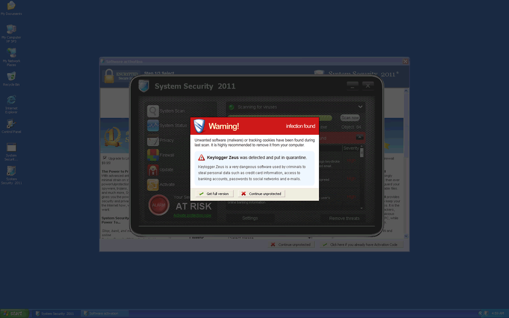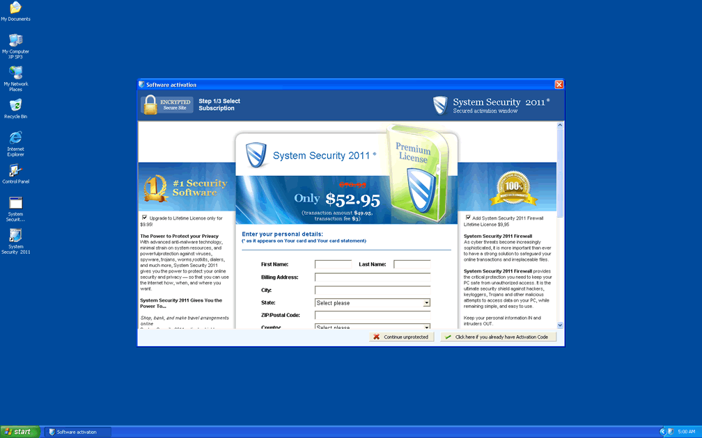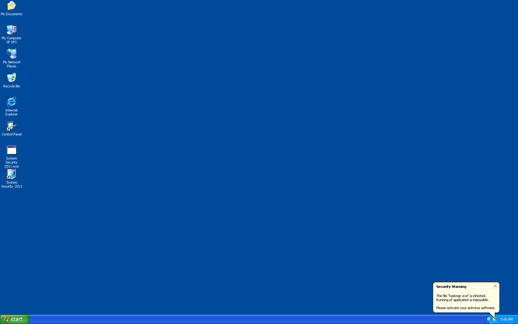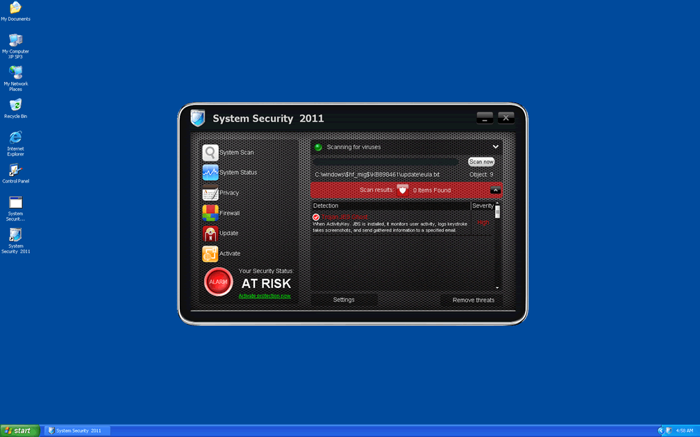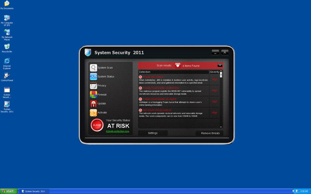 System Security 2011 is promoted by malicious websites in the form of a helpful anti-virus program and general security product, but SpywareRemove.com malware analysts have long since had familiarity with System Security 2011's fake security underpinnings – since System Security 2011 is a copy of other scamware products from the family in the first place! Examples of some of System Security 2011's clones include Any contact with these fake security applications or their websites should be considered just as harmful as installing a rootkit or Trojan onto your PC, particularly since System Security 2011's family has also been known to be bundled with the ZeroAccess rootkits, on some occasions.