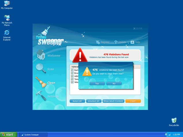 System Sweeper may install with the help of a Trojan. System Sweeper is known to emulate a computer system scan and report imaginary threats. System Sweeper will try to make you think you're infected with spyware only to push its "licensed" program to remove the supposed threats.