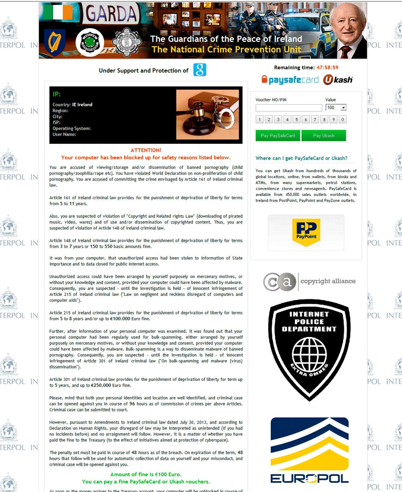 'The Guardians of the Peace of Ireland' Ransomware uses alerts that are intended to be specific to residents of Ireland. However, related fake Police Trojans are well-known for attacking diverse regions around the globe. SpywareRemove.com malware experts can point to a nearly limitless list of such – as exemplified by recent Police Ransomware Trojans like the 'Latvijas Republikas Satversmes Aizsardzības Birojs' Ransomware, the 'Uprava Kriminalistične Policije' Ransomware, the 'Služba Kriminální Policie a Vyšetřování' Ransomware, the 'FEDPOL BundesKriminalPolizei' Ransomware, the 'Police Judiciaire Fédérale' Ransomware, the 'Arma dei Carabinieri' Ransomware, the 'Dansk Rigspolitiet' Ransomware, the 'Unité Spéciale de la Police' Ransomware or the 'Agencia Federal de Investigación' Virus.