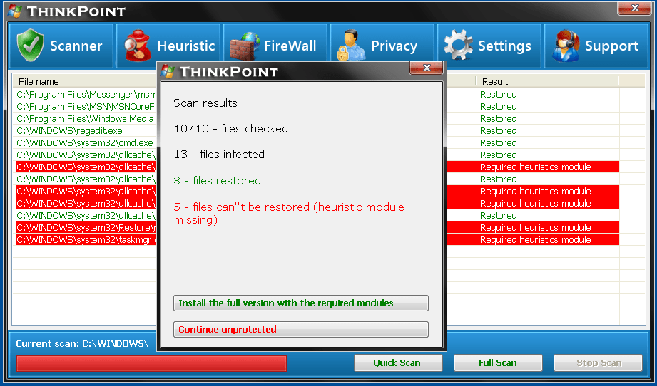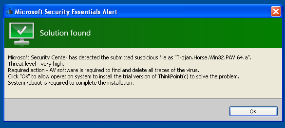 ThinkPoint is designed to trick computer users by imitating Microsoft Security Essentials through a bogus alert message. The message is fabricated by a Trojan horse prompting users to purchase the ThinkPoint program to clean the infection. ThinkPoint is not designed to clean or remove any type of legitimate threat, and consequently serving no real use to computer users.