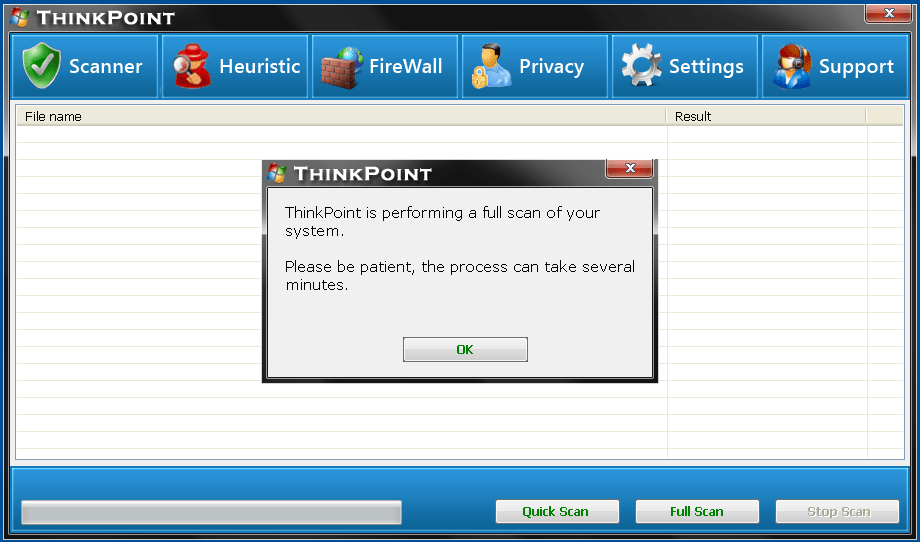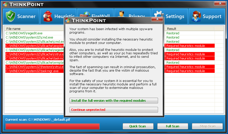 ThinkPoint (or Think Point) is a fake anti-spyware program which spreads via phony media downloads and corrupt pop-up alerts. ThinkPoint installs itself before causing chaos all over your computer by hijacking your browser and changing your registry. ThinkPoint will eventually produce a sign up screen for a heuristic program, where you'll be asked to pay USD$90 for full protection. Think Point is not a real security software so do not fall for this trickery and use an updated malware remover to make sure you PC is threat free.