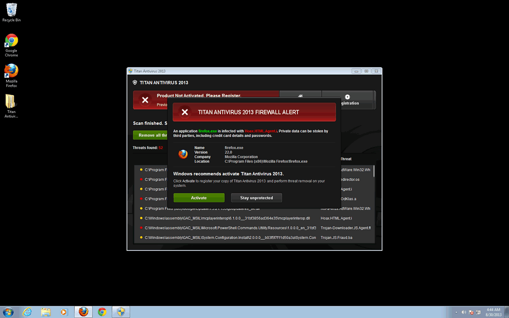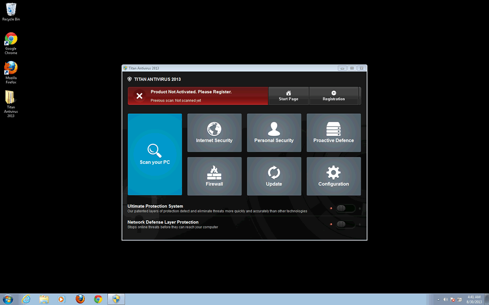 Titan Antivirus 2013 is a rogue anti-virus program that pretends to detect various PC threats on your computer for the sake of forcing you to pay for its premium registration. As scamware, Titan Antivirus 2013 doesn't have the ability to find or remove legitimate threats, nor should you consider any of Titan Antivirus 2013's features reliable protection your PC. Most likely a new variant of the FakeRean family, Titan Antivirus 2013 is capable of creating warning messages that imitate various security features and programs, most notably including firewalls, and any security information delivered by Titan Antivirus 2013 always should be considered fraudulent by default. However, real anti-malware applications should be able to remove Titan Antivirus 2013 easily once Titan Antivirus 2013 is been disabled (with some of the means for doing this explained in this article).