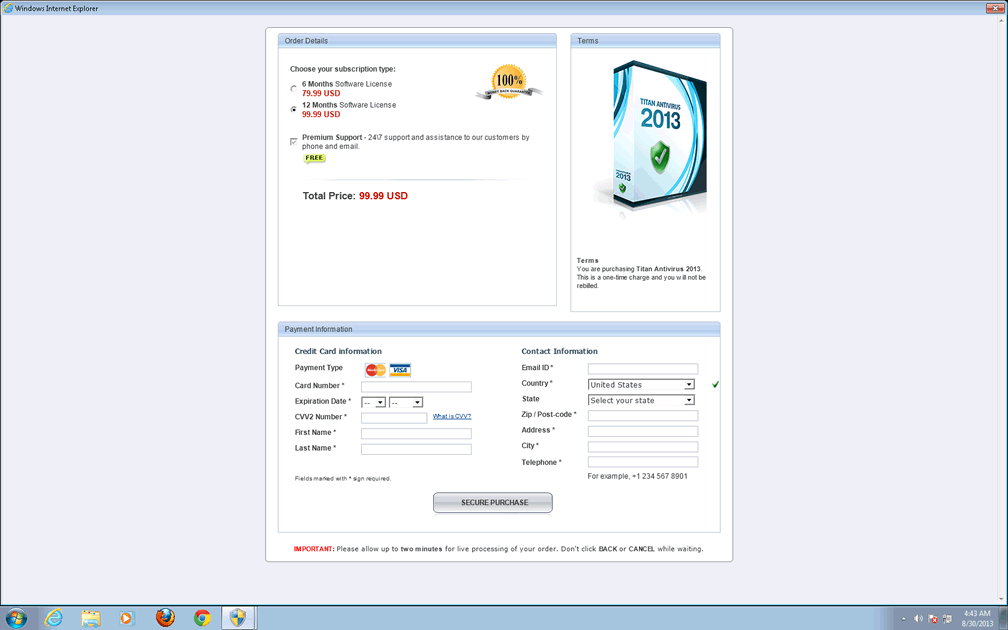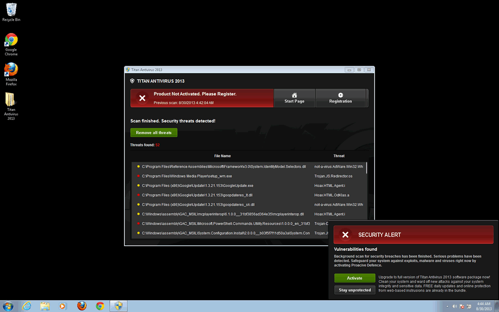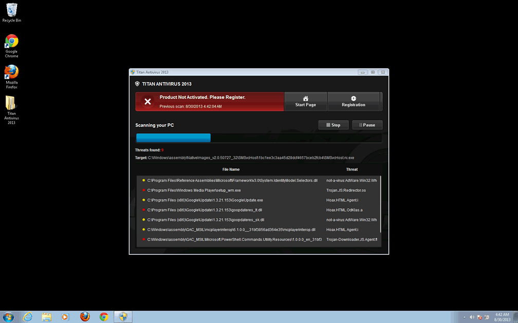 Together, these attacks present a scenario wherein buying Titan Antivirus 2013 may seem like the only thing that can keep your PC safe from a vast horde of PC threats – even though Titan Antivirus 2013 is the source of all of these problems.