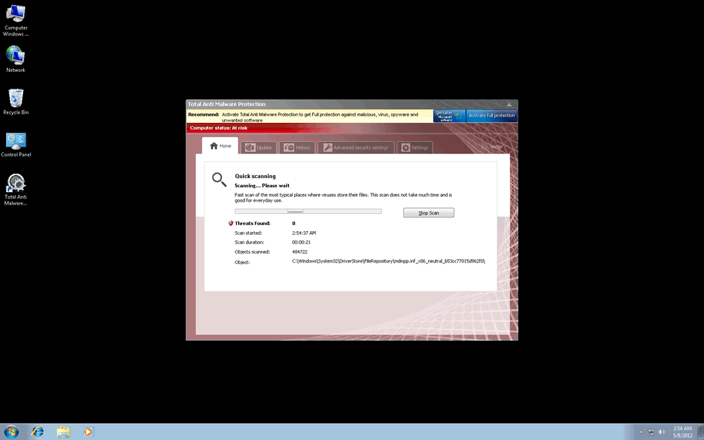 Total Anti Malware Protection, contrary to its name, is unable to find or remove any kind of malicious software or block any malicious activity that targets your computer, although Total Anti Malware Protection's various pop-ups and fake security features will try to convince you that such isn't the case. While buying Total Anti Malware Protection is the first thing its criminal coders would like you to do, SpywareRemove.com malware research team sees no benefit to doing this, and note that it's also likely to open up your financial accounts to the possibility of other fraudulent charges. Besides providing fake system scan results and security-oriented pop-ups, Total Anti Malware Protection may also: