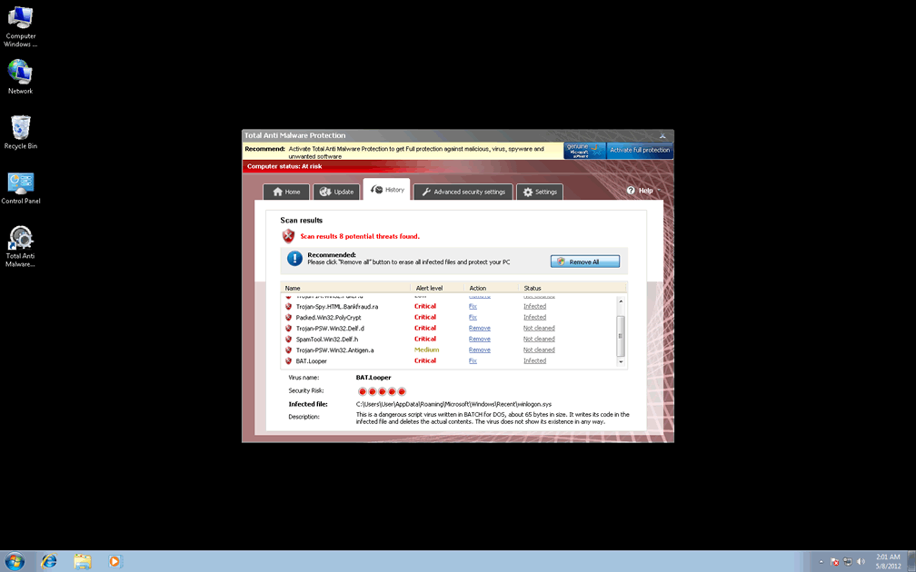 File name: %AppData%\Microsoft\Internet Explorer\Quick Launch\Total Anti Malware Protection.lnkFile type: Shortcut