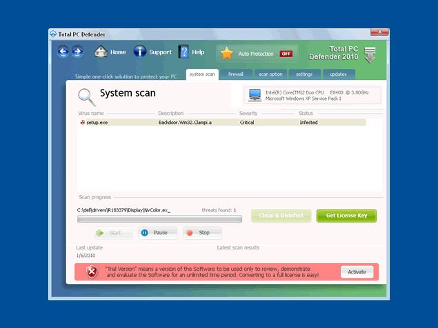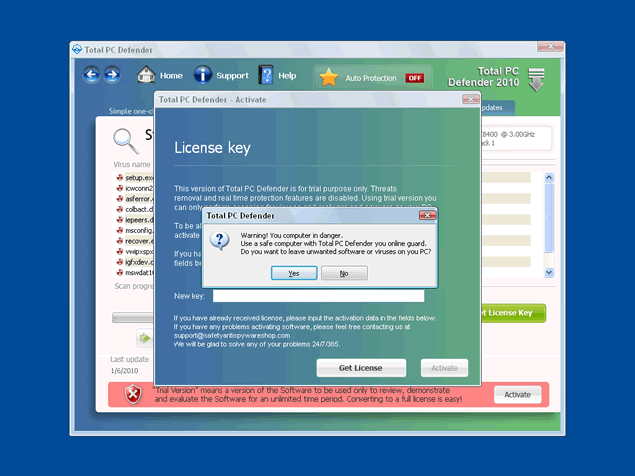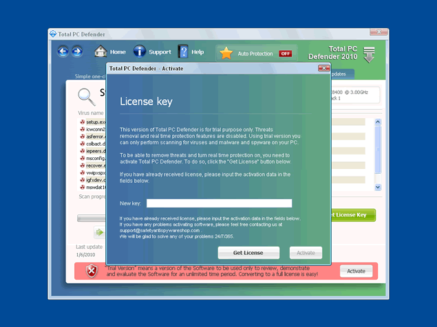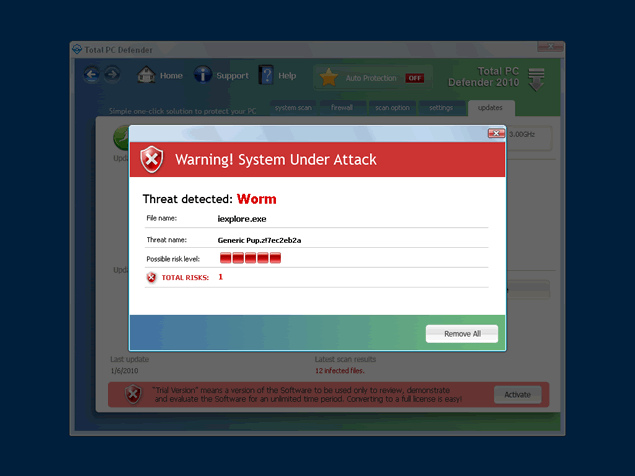 Total PC Defender 2010 (or Total PC Defender)is a rogue security program which spreads via the Internet by using Trojans and fake online security websites. Total PC Defender 2010 is installed on victim computers without the user's approval. It will secretly enter the system before modifying settings and registry entries to have itself run whenever Windows is operating. Once active, computer users may experience constant security alert pop-ups advertising Total PC Defender 2010. Total PC Defender 2010 runs its own virus scan which detects false threats on the computer to mislead users into getting the licensed version of this useless program. Total PC Defender 2010 poses a huge security threat to PC safety and should be removed immediately.