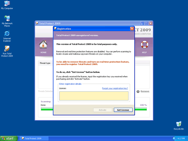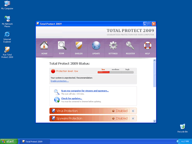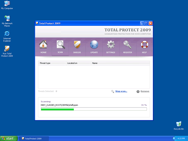 Total Protect 2009's website may seem to be a legitimate website, however, TotalProtect2009.com is the home of a major scam. All links provided by Total Protect 2009 will most likely redirect you to malicious websites that sell Total Protect 2009 as a legitimate spyware remover. Total Protect 2009 may have the ability to recreate itself after reboot. It is strongly recommended to remove Total Protect 2009 from your system upon detection.