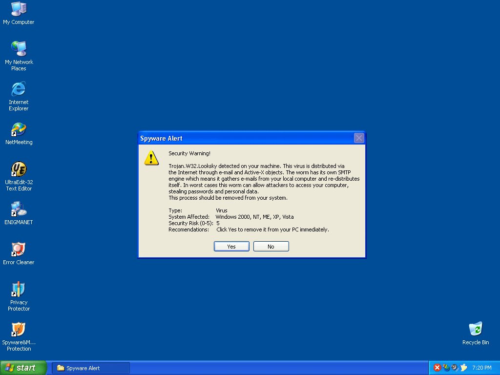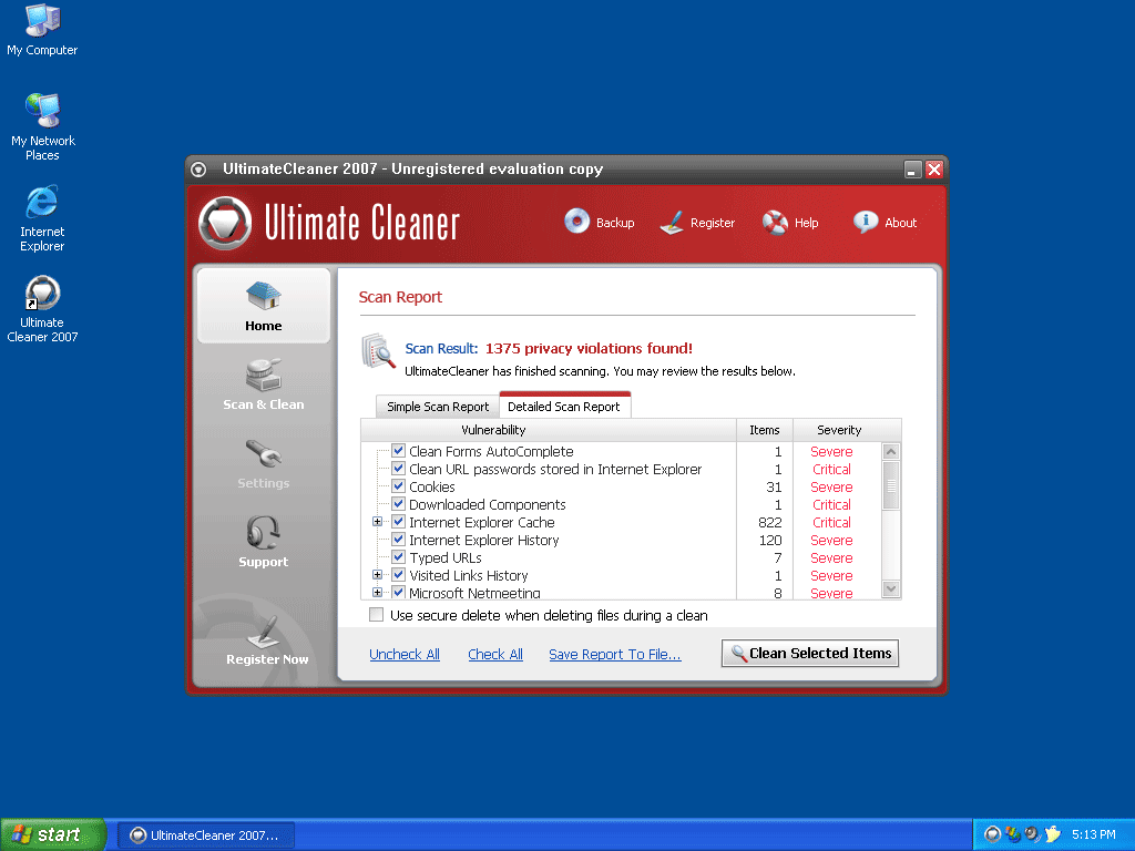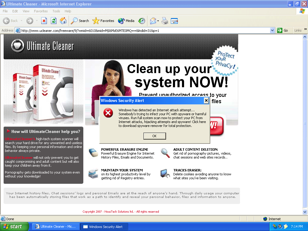 UltimateCleaner 2007 is a rogue computer security and cleanup application. Ultimate Cleaner 2007 is often downloaded and installed by a Trojan, through browser security holes, or via other unconventional and unethical mechanisms. Once installed, UltimateCleaner 2007 launches on Windows startup and may generate excessive popup advertisements. It will also display notifications of imaginary security and privacy risks in its attempts to get the user to purchase the full version and may generate system instability.