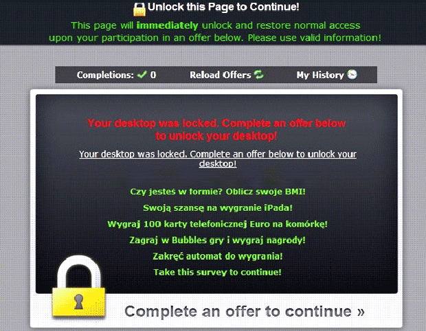 Some of the various offers that SpywareRemove.com malware researchers have associated with the 'Unlock this Page to Continue!' Virus include: