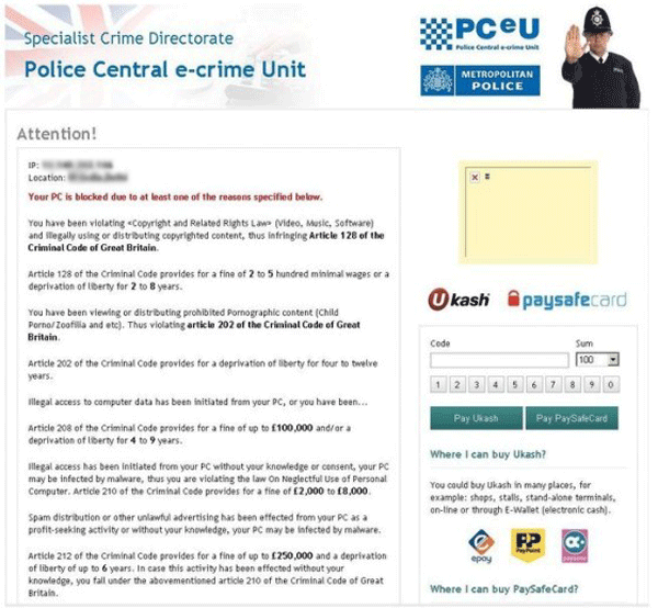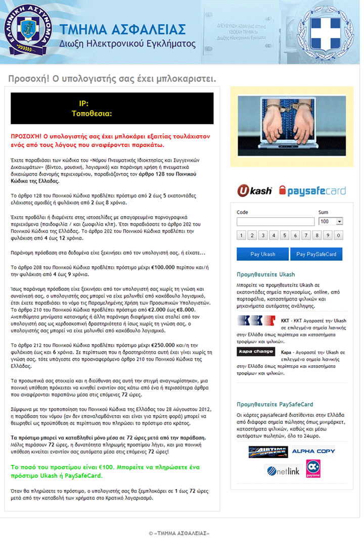 - Requests that you pay a fine via Ukash or Paysafecard, complete with brand logos for the relevant services. This fine usually is expressed in Euros of up to one hundred.