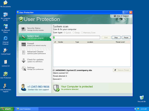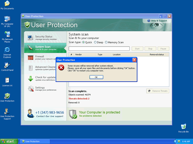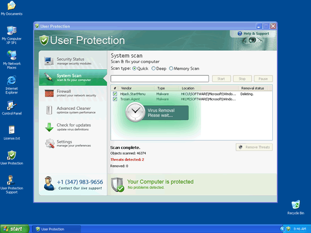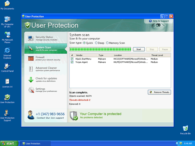 User Protection runs a fake system scan and then reports false threats on your computer. You will then be bombarded by fake warnings claiming the computer is infected with malware. Do not fall for this blatant scam designed to get hapless computer users to purchase a copy of User Protection. Remove all threats associated to this rogue before it wreaks havoc on your system.