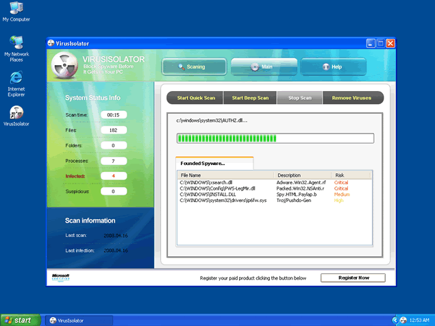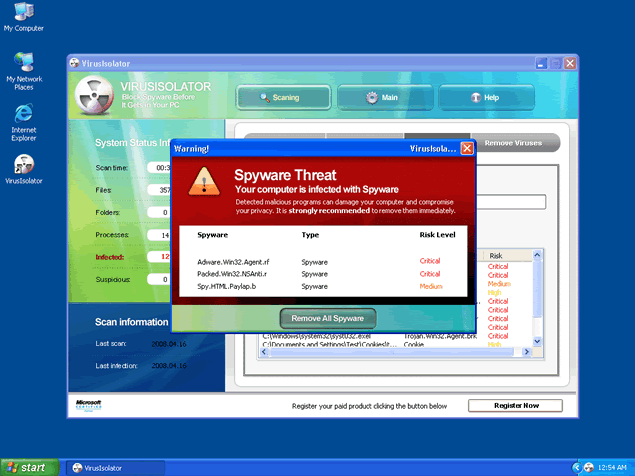 VirusIsolator, or Virus Isolator, is a rogue anti-spyware application designed to scare you into purchasing VirusIsolator's full version. VirusIsolator is usually downloaded and installed via ZLOB/MediaAccess Codec installer from an adult site. Once you're infected, the Zlob Trojan will display misleading warning messages that pop up on your Taskbar. VirusIsolator warning messages claim that your computer is infected with dangerous parasites in an attempt to trick you into purchasing VirusIsolator's commercial version. In addition, VirusIsolator may generate annoying popup advertisements that may cause unstable system performance.
