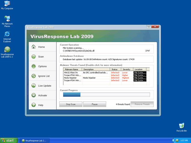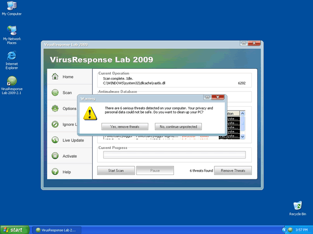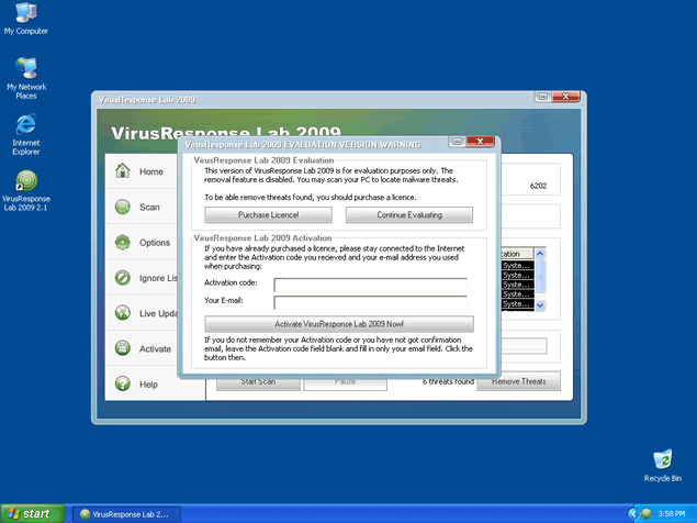 Furthermore, VirusResponse Lab 2009 is able to emulate a computer system scan and generate fake scan results to make you believe your system is flooded with spyware. All links provided by VirusResponse Lab 2009 may redirect you to VirusResponse Lab 2009's website or other malicious websites that sell VirusResponse Lab 2009's "licensed" program as a legitimate software. VirusResponse Lab 2009 is not able to detect or remove any spyware infections. VirusResponse Lab 2009 is a scam.