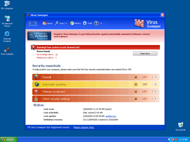 Virus Sweeper may be one of those programs that are advertised on a malicious website and once installed will start to display numerous popup messages or system notifications with bogus warnings of computer infections. Virus Sweeper may load at each boot process of Windows. Virus Sweeper was programmed by its makers to cohort you into purchasing a full version of the Virus Sweeper application which ends up being a complete waste of money. Virus Sweeper is nothing but a scam and should be removed the very moment that you detect it or find out that it is running on your computer.