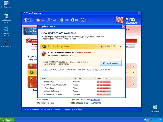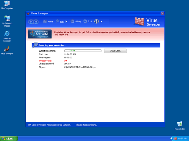Virus Sweeper is an untrustworthy program that attempts to make a claim that it can detect and remove spyware. Virus Sweeper does not remove or detect a bit of actual spyware or any other type of malware infection just like Virus Doctor, which is another rogue found to be very similar to Virus Sweeper. It is possible that Virus Sweeper is and updated version of Virus Doctor which may come from a Trojan infection or malicious website.
