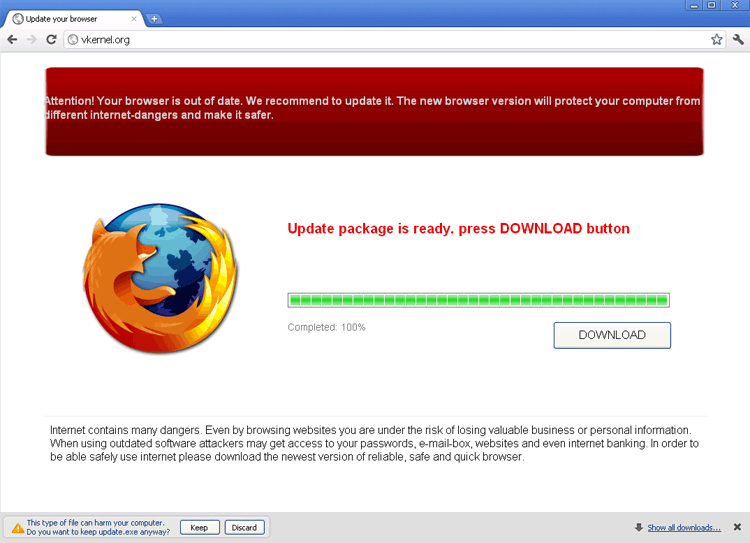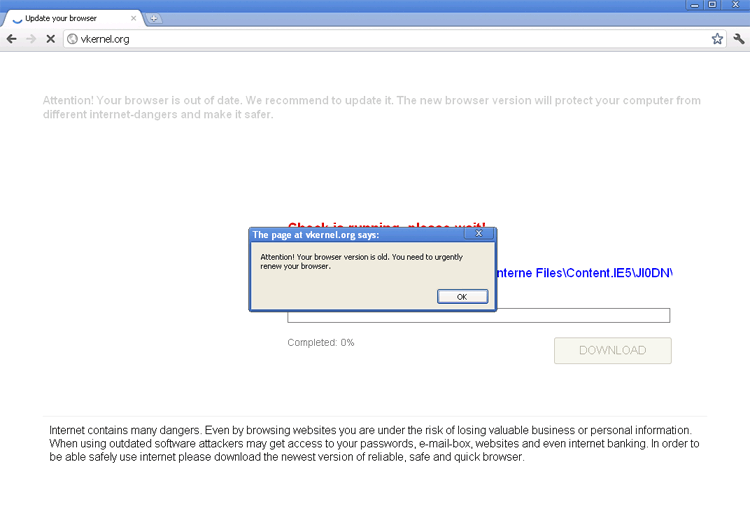 From a cursory glance, Vkernel.org may appear to be an update site for Mozilla Firefox-brand web browsers, but Vkernel.org isn't affiliated with any sort of reputable PC company or product, and multiple names in PC security have confirmed that Vkernel.org distributes malicious software under fraudulent pretenses. Vkernel.org uses the following error message to make you think that you should install its 'update' for your web browser, but Vkernel.org has no ability to detect outdated web browsers and will present this warning even if your browser is totally up-to-date: