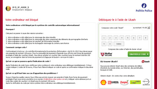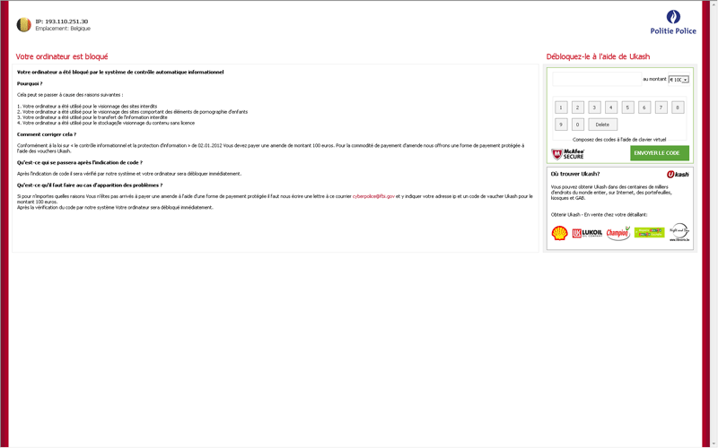 'Votre ordinateur est bloqué' Belgium Ransomware is a Belgium-based variant of what's sometimes referred to as the Ukash Virus, a ransomware Trojan that issues fake e-crime notifications and attempts to extort a ransom from its victims. 'Votre ordinateur est bloqué' Belgium Ransomware and the rest of its family have acquired their nickname due to preferential usage of the otherwise legitimate Ukash payment service, although, in some cases, other methods of money transferral (such as Paysafecard) are also accepted. Although 'Votre ordinateur est bloqué' Belgium Ransomware attempts to convince you that its warning pop-ups are legitimate and that it's affiliated with such entities as Belgium's federal police and McAfee, SpywareRemove.com malware researchers place high emphasis on both 'Votre ordinateur est bloqué' Belgium Ransomware's criminal nature and its inability to detect the crimes that it claims to find on your PC. Hence, 'Votre ordinateur est bloqué' Belgium Ransomware's pop-ups should always be ignored, and 'Votre ordinateur est bloqué' Belgium Ransomware itself should be deleted by appropriate means (such as an anti-malware scanner).