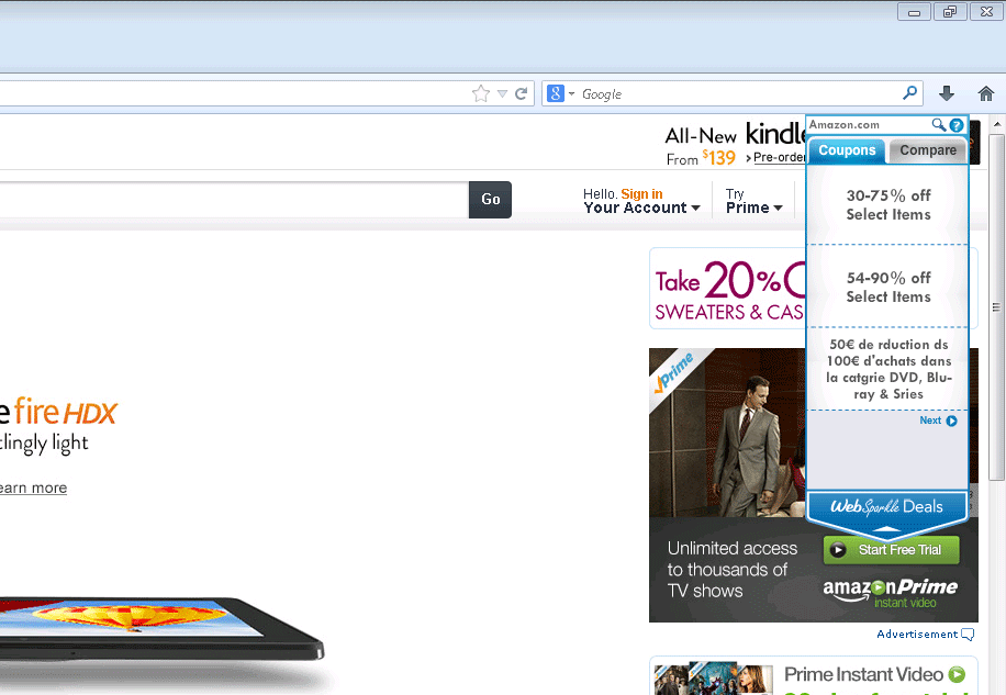WebSparkle is adware that may display annoying pop-up ads within Internet Explorer, Mozilla Firefox and Google Chrome. WebSparkle pop-up ads may be displayed regardless of the web browser or search engine, and if a PC user is seeing ads from WebSparkle whenever he is performing an online search in any legal search provider or is visiting a certain commercial website, then the computer may be infected with adware or other PC threats. WebSparkle may be created by attackers specifically to earn money from click fraud and raised website traffic. WebSparkle may boost web traffic by forced redirects, gather sales leads for other tricky websites, and show pop-up advertisements, sponsored links and coupons within the targeted web browser. WebSparkle may be spread stealthily through infected websites, or genuine websites that have been hijacked. WebSparkle may also proliferate via malicious spam email attachments, which contain attachments or links to insecure websites. WebSparkle may also be downloaded manually by fooling Internet user into thinking they are installing a beneficial software product. WebSparkle may also be distributed via peer-to-peer file sharing websites and is often packaged with pirated or illegitimately acquired tools.
