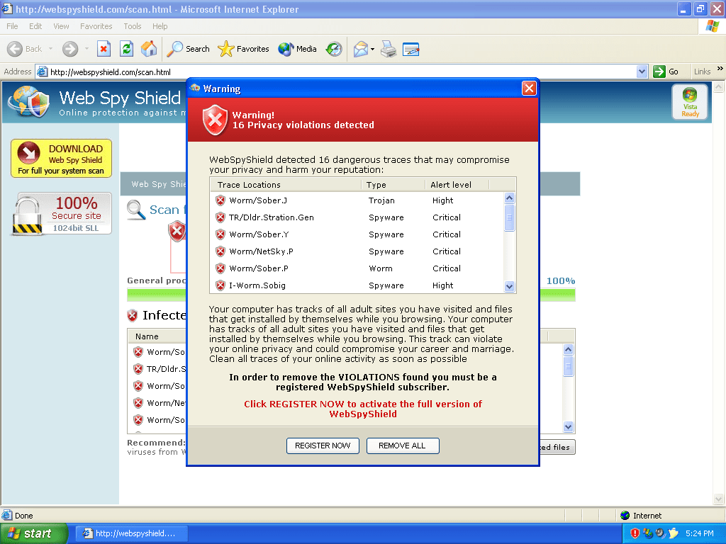 WebSpyShield is a rogue spyware removal utility that usually creeps into the system through browser security exploits, Trojans and other illicit mechanisms. WebSpyShield installs as a browser toolbar and may display fake security alerts claiming that your machine is infected with various imaginary parasites. This is the method how it gets the user into purchasing the full version of the program. Moreover, WebSpyShield may modify your browser settings and redirect your homepage to its webpage.