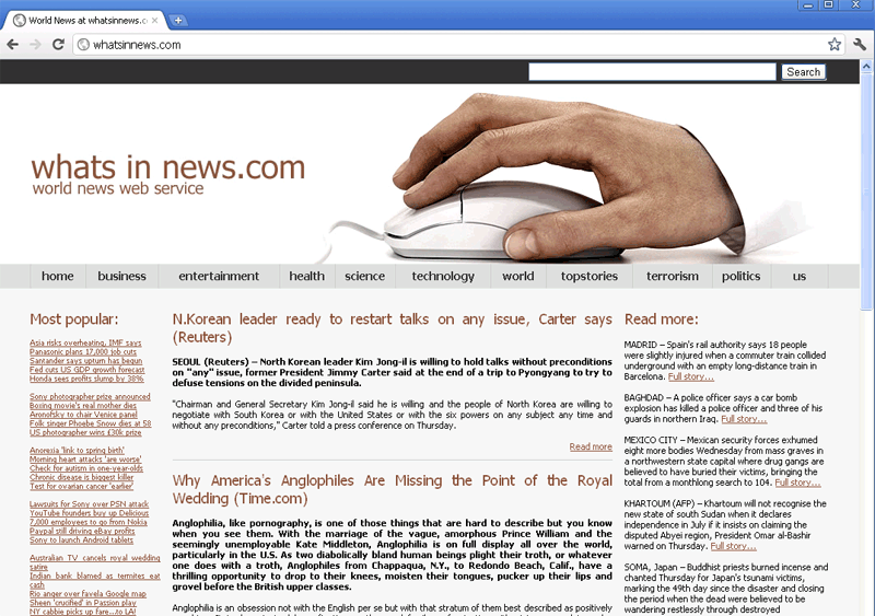 WhatsInNews.com puts up a simple pretense of having search-related features, but WhatsInNews.com's web masters haven't built-in any of the complex and necessary features or safeguards that real search engines use. Results from WhatsInNews.com may be stolen from other search engines or be affiliated with malicious websites that can be a source of contact with worthless advertisements, phishing attempts, drive-by-downloads and the promotion of fraudulent security applications. WhatsInNews.com saves its only actual content, aggregated news articles, for its front page, but even at this, WhatsInNews.com performs its services more poorly than any equivalent and trustworthy website would be able to manage.
