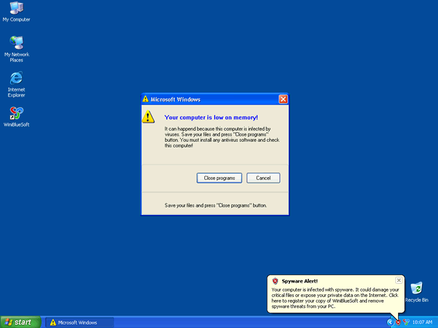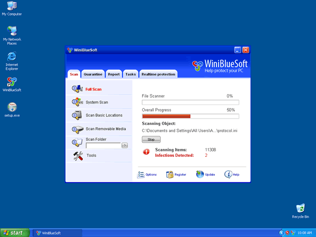 WinBlueSoft is a rogue anti-spyware program that is basically a rename of WiniBlueSoft. Advertised through the use of Trojans that constantly display fake security alerts stating that your computer is infected and that you should download and install WinBlueSoft in order to repair and protect your PC. These infection alerts are all fabricated, however, and should not be taken seriously. WinBlueSoft is also able to create a file that blocks applications on your system making it difficult to carry out various functions on your computer. Your desktop may be susceptible to being hijacked with a bogus alert messages that read like the following: