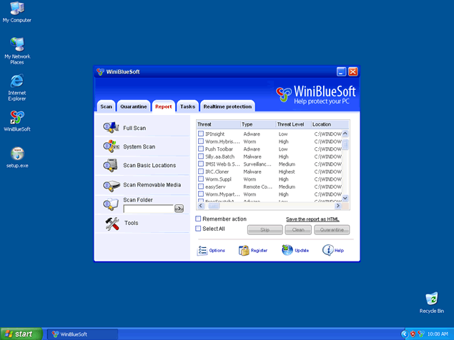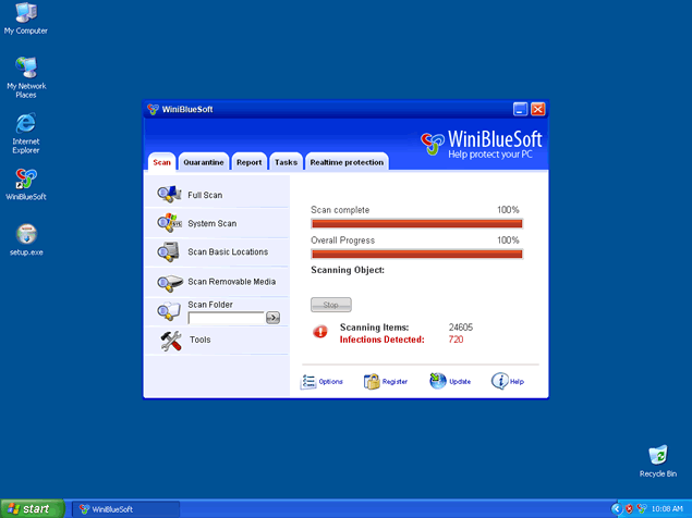 The message above is one example of the devious methods that WinBlueSoft uses to manipulate your perception. WinBlueSoft, in the full version form, is not able to effectively detect or remove any type of spyware or malware.
