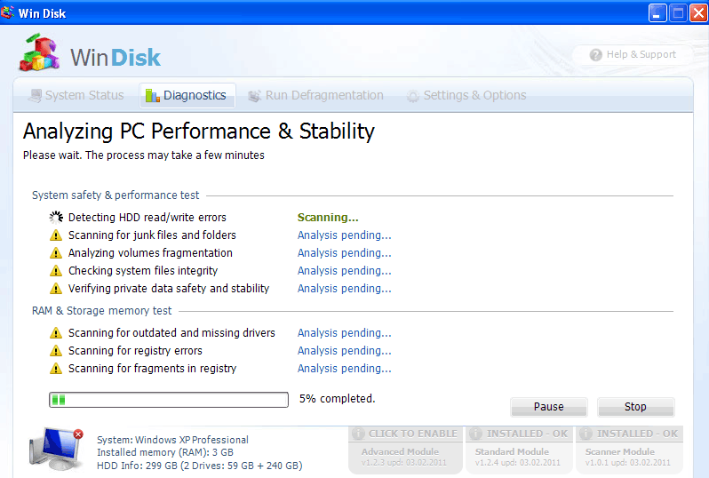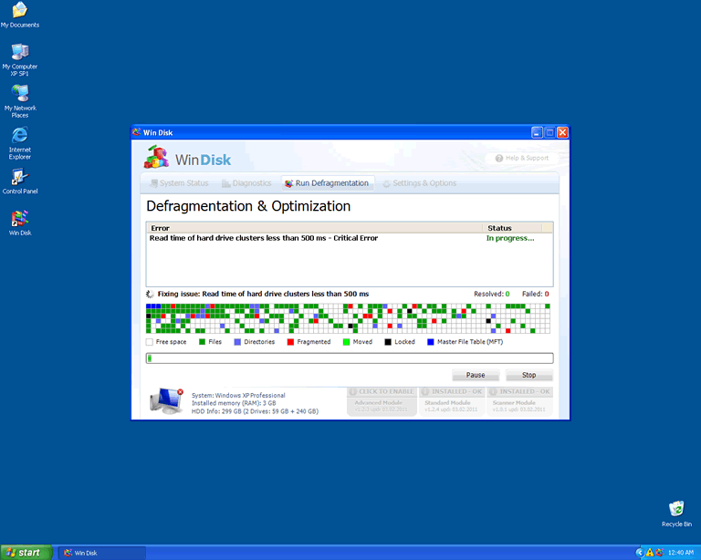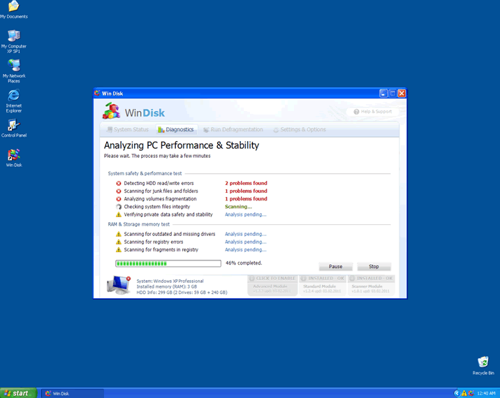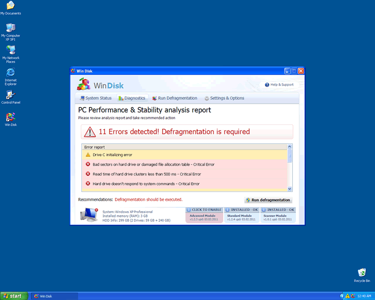 The idea is to get the user to think that WinDisk is legitimate security software that must be purchased to fix the computer. This is encouraged by directing the user to launch a fake system scan after any error, and then eventually indicating that the 'full' version of the program will be more effective at cleaning out your PC. Nothing could be more distant from the truth - many of WinDisk's error messages are entirely false alerts, while others are derived from problems caused by WinDisk deliberately.