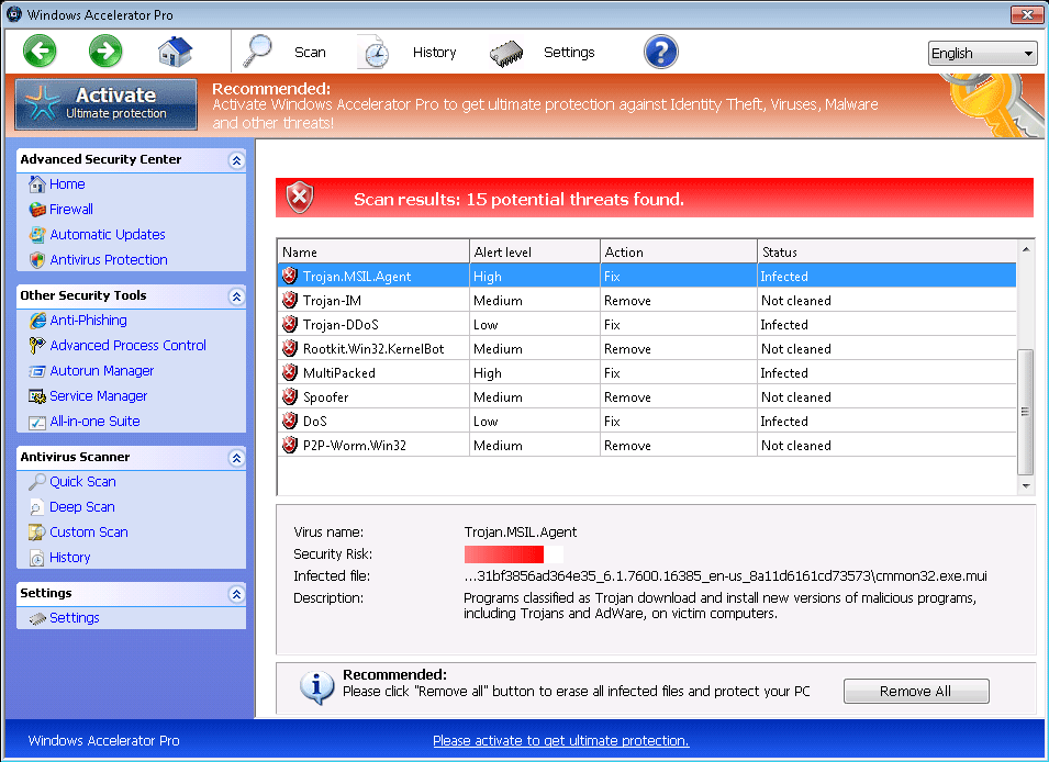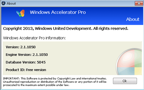 Windows Accelerator Pro is disguised as a generic anti-malware and system optimization scanner, but Windows Accelerator Pro is completely incapable of providing authentic scan results. Since Windows Accelerator Pro's main intention is to make money off of potentially ignorant PC users, Windows Accelerator Pro regularly launches warning messages that are meant to resemble the security alerts of real anti-malware programs upon the detection of high-level threats, such as keyloggers, worms or banking Trojans. Information originating from Windows Accelerator Pro always can be considered fraudulent, and malware experts would emphasize the important of identifying Windows Accelerator Pro's alerts, separately from the alerts of your native security programs.