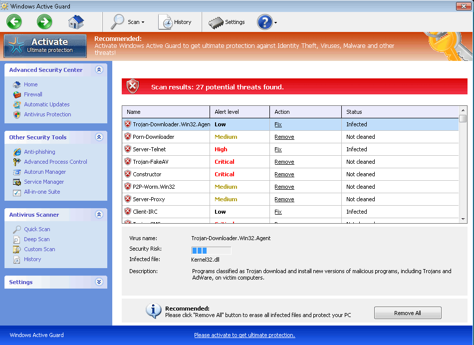 Even a passing familiarity with the FakeVimes category of rogue anti-malware programs should allow you to detect Windows Active Guard as soon as Windows Active Guard displays itself, since Windows Active Guard includes characteristic traits such as an 'Advanced Process Control,' 'All-in-one Suite' and overall features that are copied from outdated versions of Microsoft's Windows Security Center. Similar rogue anti-malware programs from Windows Active Guard's family include Privacy Guard Pro, Extra Antivirus, Fast Antivirus 2009, Presto TuneUp, Windows Security Suite, Smart Virus Eliminator, Packed.Generic.245, Volcano Security Suite, Windows Enterprise Suite, Enterprise Suite, Additional Guard, Live PC Care, PC Live Guard, Live Enterprise Suite, Security Antivirus, My Security Wall, CleanUp Antivirus, Smart Security and PrivacyGuard Pro 2.0.