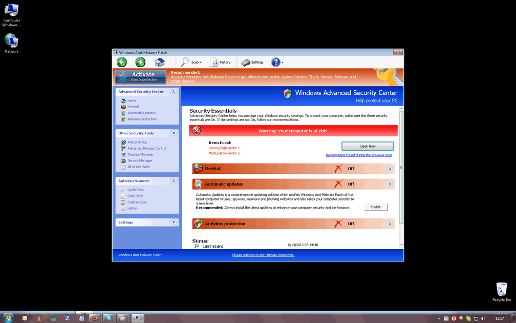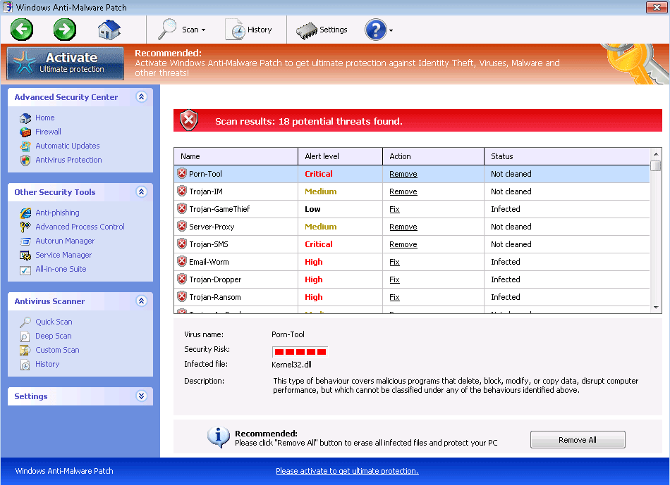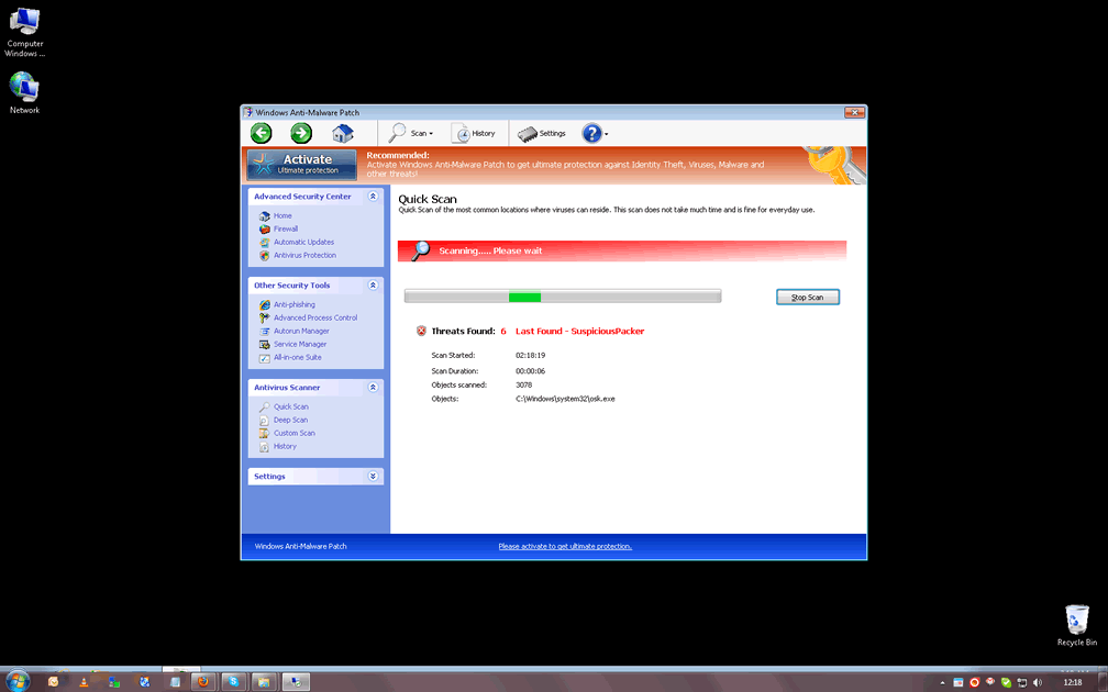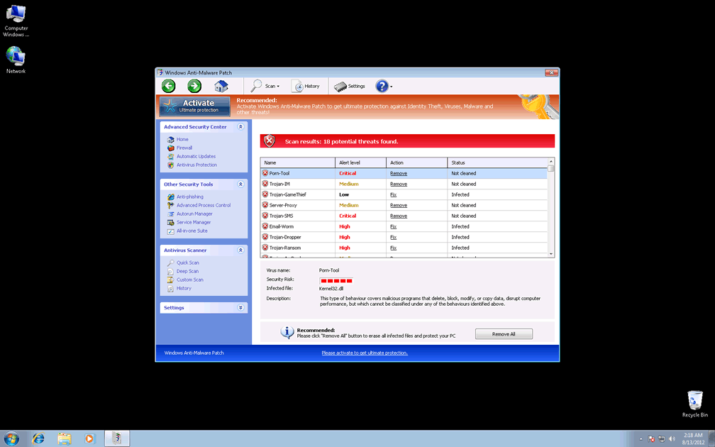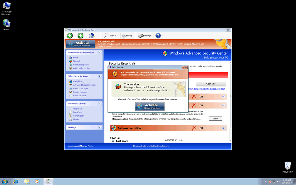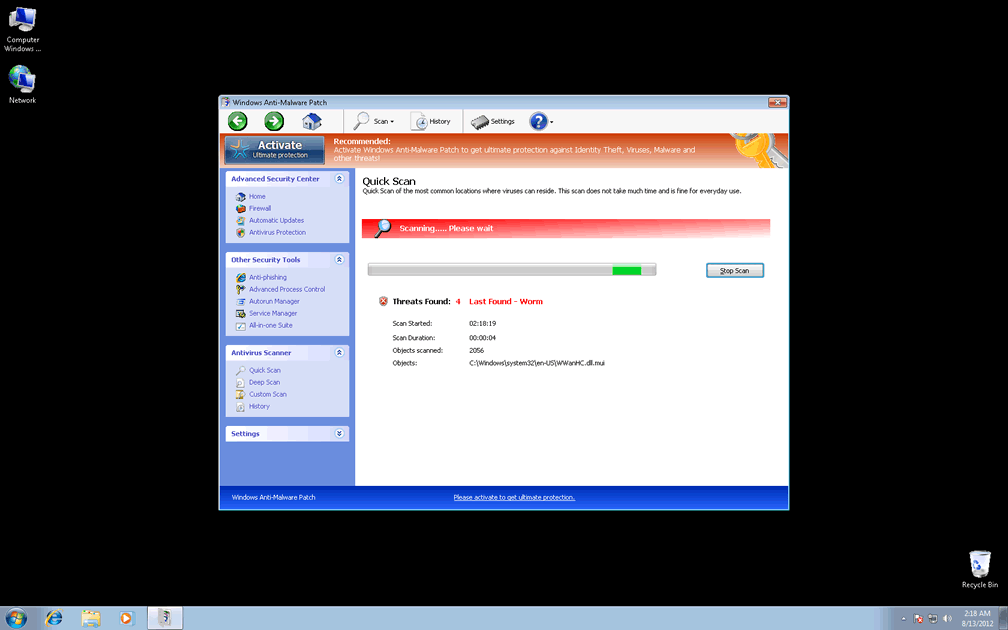 Windows Anti-Malware Patch doesn't have any ability to find real PC threats, but swaps such features out for the ability to create realistic-looking fake alerts and other forms of pop-ups. Some such pop-ups have been known to imitate Windows applications, such as the Windows Security Center or Microsoft Security Essentials, although Windows Anti-Malware Patch isn't affiliated with Microsoft or the Windows OS. The fake infections that Windows Anti-Malware Patch detects can include such threats as trojans, adware and worms – most likely in hopes of making you flee in terror straight to Windows Anti-Malware Patch's purchase form, wherein it claims it can delete these imaginary problems after purchase.