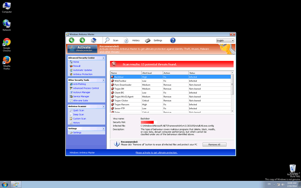 Windows Antivirus Master's main threat to your state of finance is to use false pretenses to encourage the purchase of its software, but even if you ignore that risk, allowing Windows Antivirus Master to be installed on any PC is a major risk to your security. Windows Antivirus Master's ability to close other programs on a whim is easily expandable to avenues other than those elaborated on in this article, and malware researchers, accordingly, have classified Windows Antivirus Master as a high-level threat. Removing Windows Antivirus Master without anti-malware utilities, while possible, is discouraged, particularly due to the possibility of any improper Registry changes damaging your operating system.