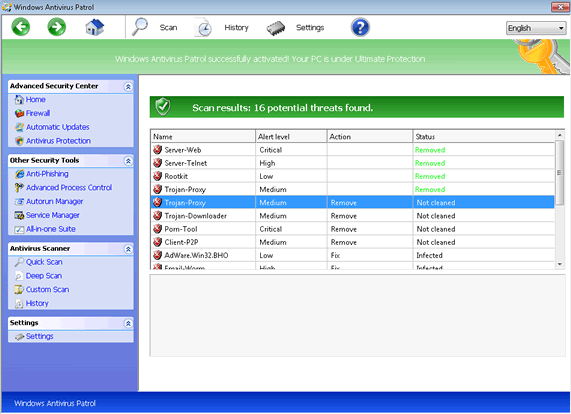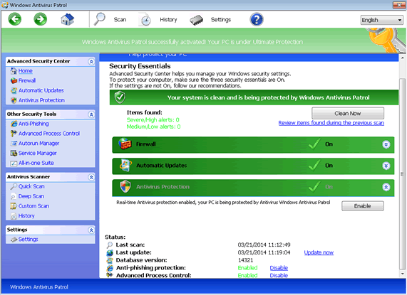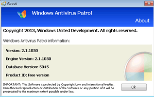 Windows Antivirus Patrol is scamware of the same family as other FakeVimes members, and is very similar to other scamware from FakePAV and Tritax-based PC threats, which sometimes are referred to by the name term NameChanger. Their flexibility in brand names has been responsible for dozens of clones of Windows Antivirus Patrol and its nearest relatives, with most major features identical between versions, but under names like Privacy Guard Pro, Extra Antivirus, Fast Antivirus 2009, Presto TuneUp, Windows Security Suite, Smart Virus Eliminator, Packed.Generic.245, Volcano Security Suite, Windows Enterprise Suite, Enterprise Suite, Additional Guard, Live PC Care, PC Live Guard, Live Enterprise Suite, Security Antivirus, My Security Wall, CleanUp Antivirus, Smart Security and PrivacyGuard Pro 2.0. Windows Antivirus Patrol and its relatives are unable to detect legitimate threats, but, instead, possess functions that permit them to fake these security features.