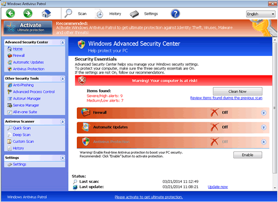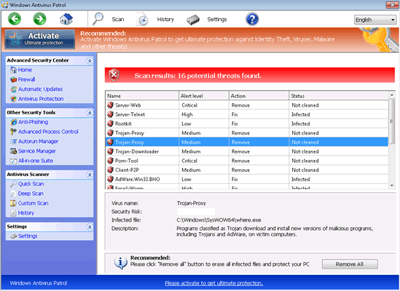 Windows Antivirus Patrol is a rogue anti-malware scanner that includes the ability to 'scan' your computer, but uses this function to create erroneous lists of fake infections. While Windows Antivirus Patrol is busy trying to make the purchase of its software seem helpful, Windows Antivirus Patrol also may conduct other attacks that malware experts rate as major security risks, up to and including blocking software that plays a critical role in system maintenance. Windows Antivirus Patrol is classified as a threat, and uninstalling Windows Antivirus Patrol, rather than paying for Windows Antivirus Patrol, always should be the first item on your agenda when dealing with an infected PC.