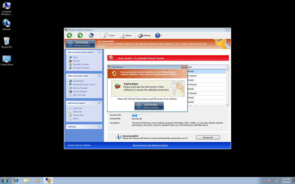 After using another brand of software as Windows Antivirus Release's vehicle to get into your computer, Windows Antivirus Release will continue its farce by pretending to detect a colorful range of PC threats. These alerts will continue even if the only thing that's wrong with your PC is Windows Antivirus Release, and include such detections as: