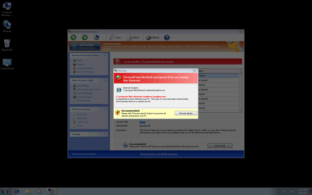 | 2 | Firewall has blocked a program from accessing the Internet Internet Explorer C:program filesinternet exploreriexpolre.exe C:program filesinternet exploreriexpolre.exe is suspected to have infected your PC. This type of virus intercepts entered data and transmits them to a remote server. Recommended: Please click "Prevent attack" button to prevent all attacks and protect your PC |