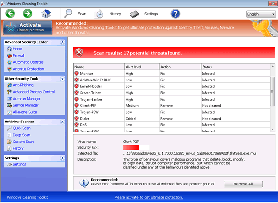 Like other fake system optimizers and rogue anti-malware products, Windows Cleaning Toolkit is carefully-designed to look just like an actual system-scanning utility, but doesn't have any of the real features of one. Current evidence gathered by malware analysts has led to the indication of Windows Cleaning Toolkit most likely being a part of the FakeVimes family, which includes many other brand name variants of similar scamware. Some examples of all of Windows Cleaning Toolkit's relatives engaging in similarly fraudulent misbehavior can include Privacy Guard Pro, Extra Antivirus, Fast Antivirus 2009, Presto TuneUp, Windows Security Suite, Smart Virus Eliminator, Packed.Generic.245, Volcano Security Suite, Windows Enterprise Suite, Enterprise Suite, Additional Guard, Live PC Care, PC Live Guard, Live Enterprise Suite, Security Antivirus, My Security Wall, CleanUp Antivirus, Smart Security and PrivacyGuard Pro 2.0.
