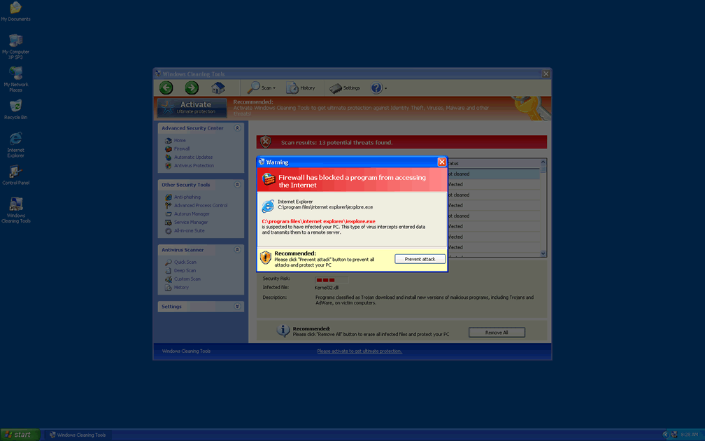 Windows Cleaning Tools has the basic look of an anti-virus scanner along with an apparent availability of many extra features (such as a processes monitor and anti-phishing security), but what Windows Cleaning Tools doesn't tell you is that these features are completely fake. Although they'll provide various types of system information, including multiple types of pop-up alerts and system scans, this info is entirely designed to make you think that imaginary PC threats assailing your computer. Once you've fallen for the first step in the Windows Cleaning Tools hoax, Windows Cleaning Tools continues phase two and offers a readily available solution – purchasing Windows Cleaning Tools's registration key so that Windows Cleaning Tools can remove these fake threats that only Windows Cleaning Tools can detect.