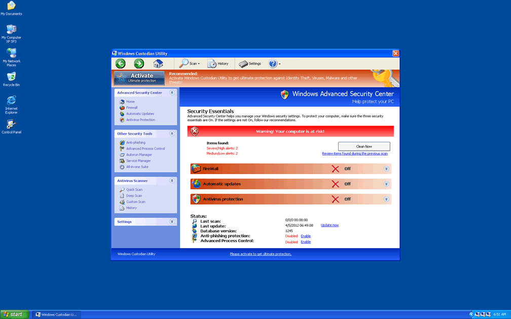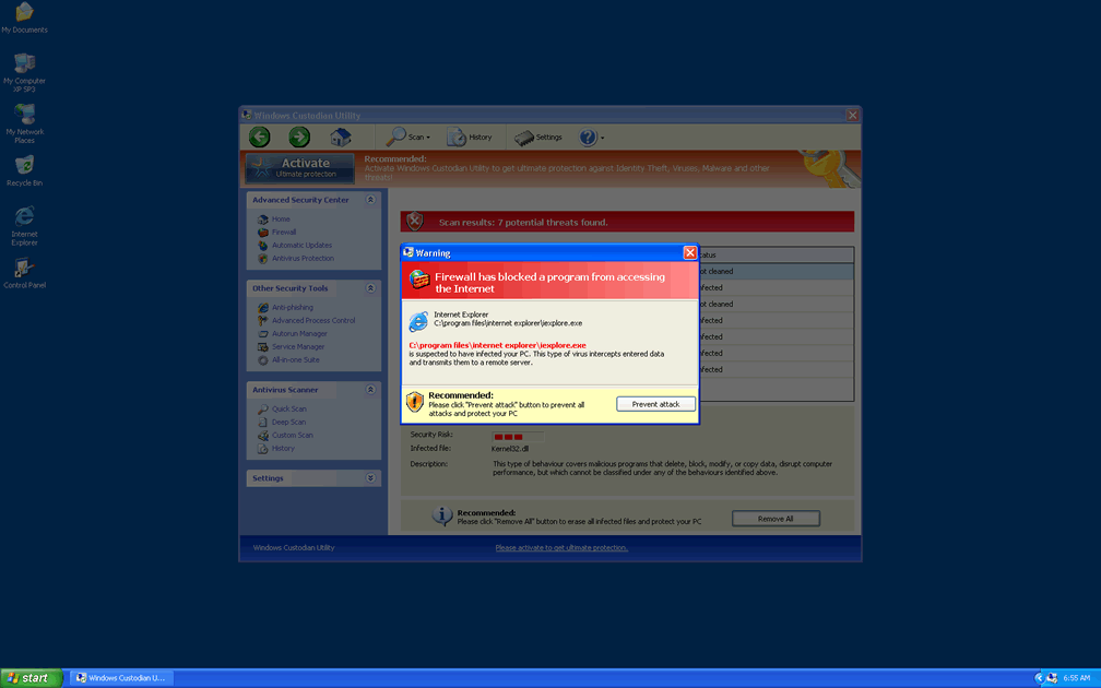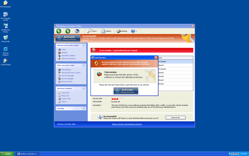 Windows Custodian Utility and other FakeVimes-based PC threats share the same basic marketing and scamming tactics that are also in use by such scamware programs as Privacy Guard Pro, Extra Antivirus, Fast Antivirus 2009, Presto TuneUp, Windows Security Suite, Smart Virus Eliminator, Packed.Generic.245, Volcano Security Suite, Windows Enterprise Suite, Enterprise Suite, Additional Guard, Live PC Care, PC Live Guard, Live Enterprise Suite, Security Antivirus, My Security Wall, CleanUp Antivirus, Smart Security and PrivacyGuard Pro 2.0. After Windows Custodian Utility's installation (which can be enabled via fake codec updates, Trojans like Zlob and fake online scanners), Windows Custodian Utility will start with Windows and display inaccurate system information in the form of scan results and pop-up alerts. This information will notify you about nonexistent infections, including spyware, rootkits and ongoing attacks against your PC that should all be ignored as fake.