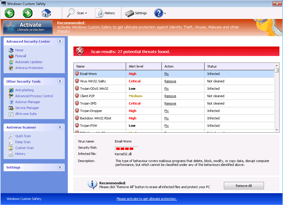 Windows Custom Safety is marketed in the form of a multi-featured security and anti-malware product, but its software actually is focused on the opposite aim: of making your computer unsafe, feeding you false security information and blocking anything that could thwart these attacks. These are traits that Windows Custom Safety shares with other variants of FakeVimes such as Privacy Guard Pro, Extra Antivirus, Fast Antivirus 2009, Presto TuneUp, Windows Security Suite, Smart Virus Eliminator, Packed.Generic.245, Volcano Security Suite, Windows Enterprise Suite, Enterprise Suite, Additional Guard, Live PC Care, PC Live Guard, Live Enterprise Suite, Security Antivirus, My Security Wall, CleanUp Antivirus, Smart Security and PrivacyGuard Pro 2.0. While Windows Custom Safety launches with Windows and is easily identified, its attacks are not always as out-in-the-open, and SpywareRemove.com malware researchers have noted common Windows Custom Safety symptoms as shown below: