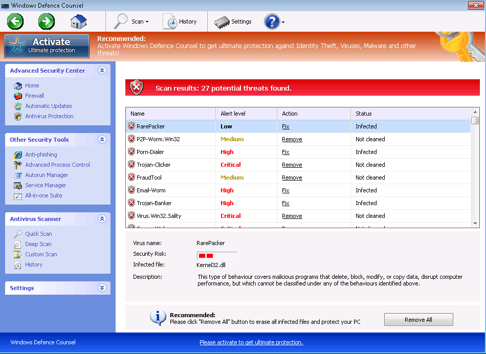 Windows Defence Counsel is verified as just another copy-and-paste member of FakeVimes, a classification for related scamware anti-malware products, with recent members being particularly similar in appearance and functionality. Other variants of FakeVimes that bear a strong resemblance to Windows Defence Counsel, although this list is far from conclusive, include Privacy Guard Pro, Extra Antivirus, Fast Antivirus 2009, Presto TuneUp, Windows Security Suite, Smart Virus Eliminator, Packed.Generic.245, Volcano Security Suite, Windows Enterprise Suite, Enterprise Suite, Additional Guard, Live PC Care, PC Live Guard, Live Enterprise Suite, Security Antivirus, My Security Wall, CleanUp Antivirus, Smart Security and PrivacyGuard Pro 2.0. Identifying traits of Windows Defence Counsel and related rogue anti-malware programs consist of an 'Activate Ultimate Protection' button, features such as the 'Advanced Process Control' and an overall interface that imitates the outdated Windows Security Center software.
