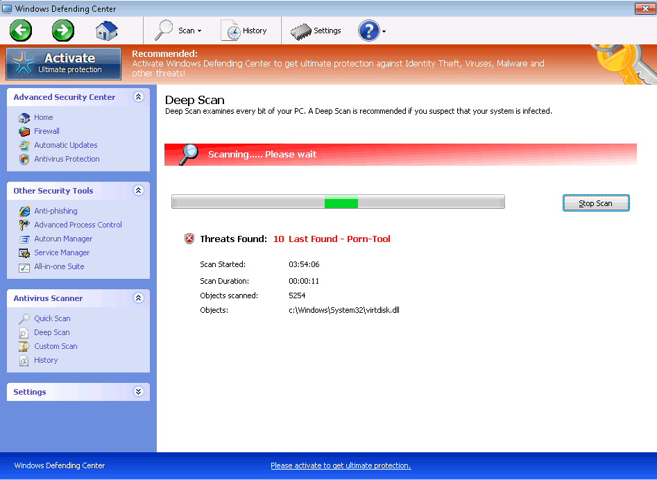 Windows Defending Center can also be identified as a clone of such modern FakeVimes-based PC threats as Privacy Guard Pro, Extra Antivirus, Fast Antivirus 2009, Presto TuneUp, Windows Security Suite, Smart Virus Eliminator, Packed.Generic.245, Volcano Security Suite, Windows Enterprise Suite, Enterprise Suite, Additional Guard, Live PC Care, PC Live Guard, Live Enterprise Suite, Security Antivirus, My Security Wall, CleanUp Antivirus, Smart Security and PrivacyGuard Pro 2.0. All of these rogue anti-virus programs should be considered just as malicious to your computer as Windows Defending Center could be, and are easily identified by having an identical interface to Windows Defending Center.