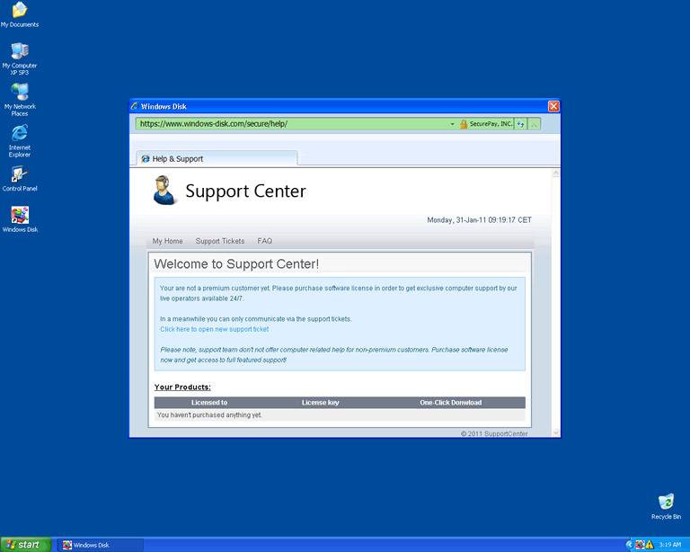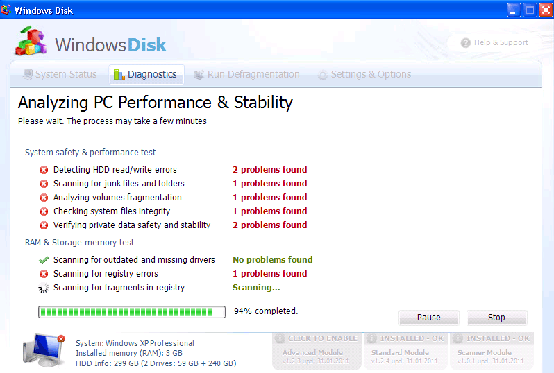 The rogue defragmenter Windows Disk creeps onto hard drives quietly and then tries to play the part of a useful trial version of a system tool. Windows Disk does this poorly, however, since Windows Disk isn't able to perform any of the tasks of a true defragmenter, and will cause obvious and alarming problems on your system. Getting rid of not just Windows Disk but also the original infection that likely installed Windows Disk is highly important if you place any value on the integrity of your hard drive. Holding back on taking action may result in serious damage that can't be reverted, due to the invasive nature of Windows Disk's functions.