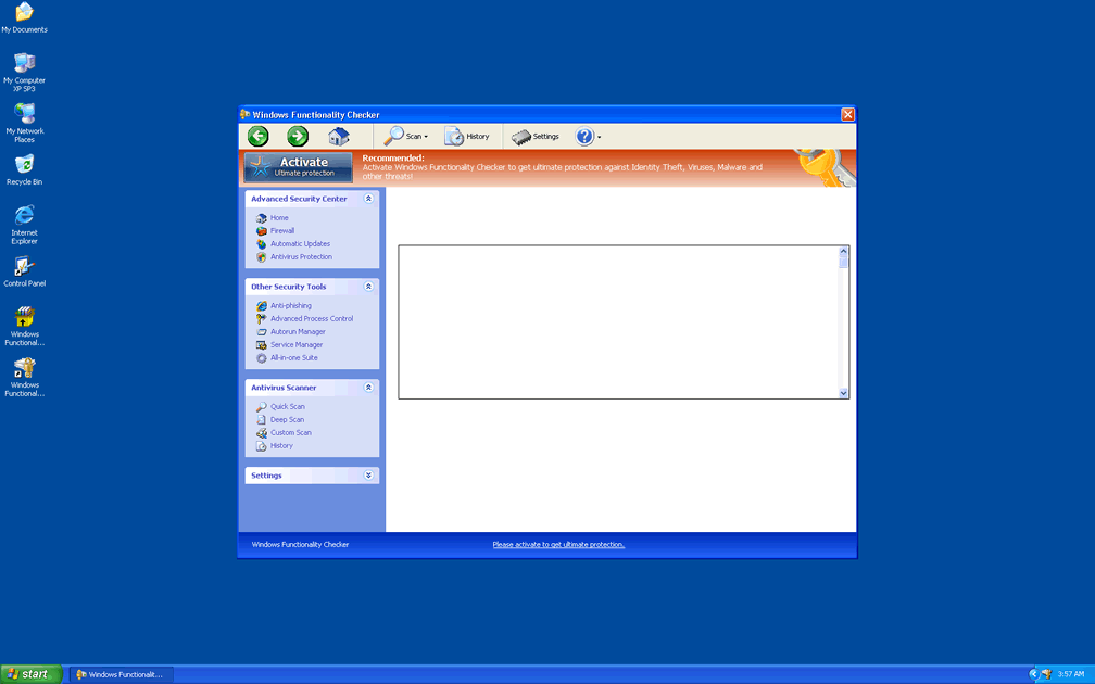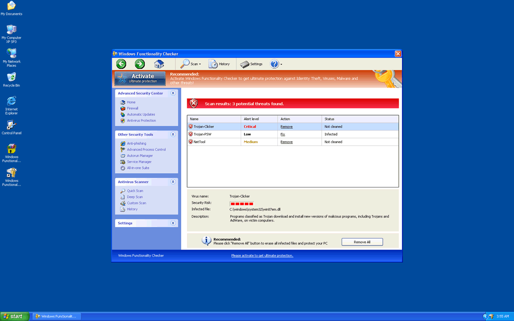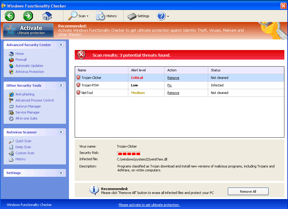 Windows Functionality Checker does its best to appear as trustworthy as Microsoft Security Essentials, and to this end, copies a great deal of the latter's appearance. Functions that Windows Functionality Checker pretends to possess can include complete system scans for malicious software, automatic self-updating and protection against phishing attacks. However, all of Windows Functionality Checker's features are fake and only imitate the appearance of being useful while avoiding any actual payoff that would benefit your PC. SpywareRemove.com malware experts especially emphasize that Windows Functionality Checker can neither find nor delete PC threats, such as worms, Trojans or rootkits from your computer. However, Windows Functionality Checker may use warning messages like the ones below to fool you into thinking differently: