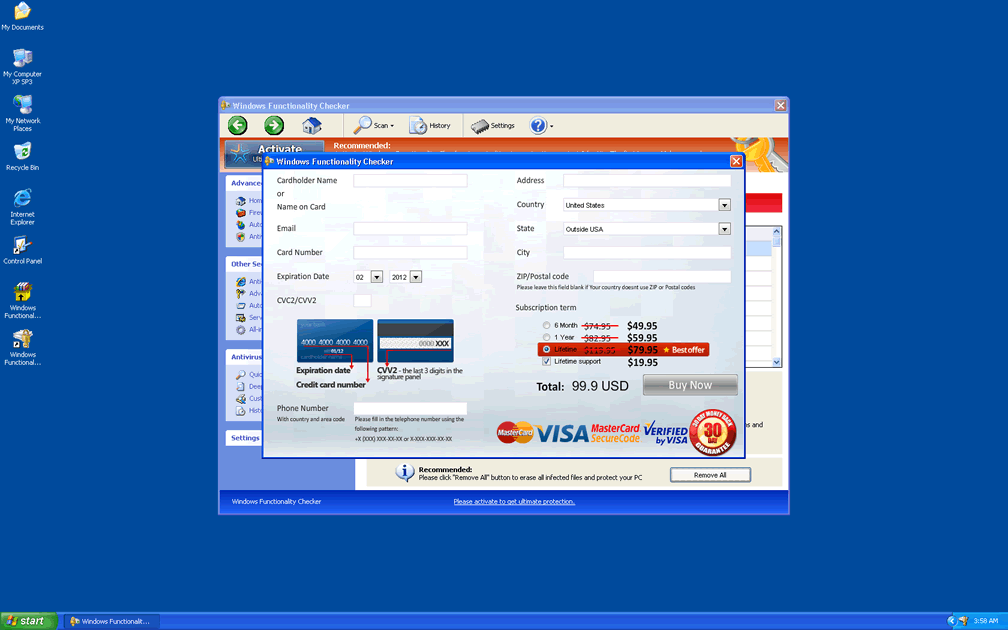 Windows Functionality Checker was only noted as a danger in February of 2012, but Windows Functionality Checker's family of scamware is significantly older than this date and extends back to 2011. Similar programs from Windows Functionality Checker's classification include, for just a few examples, Privacy Guard Pro, Extra Antivirus, Fast Antivirus 2009, Presto TuneUp, Windows Security Suite, Smart Virus Eliminator, Packed.Generic.245, Volcano Security Suite, Windows Enterprise Suite, Enterprise Suite, Additional Guard, Live PC Care, PC Live Guard, Live Enterprise Suite, Security Antivirus, My Security Wall, CleanUp Antivirus, Smart Security and PrivacyGuard Pro 2.0. You should treat all of these members of the FakeVimes family of rogue security products to be just as hostile to your PC as Windows Functionality Checker would be and remove them with a similar application of anti-malware software.